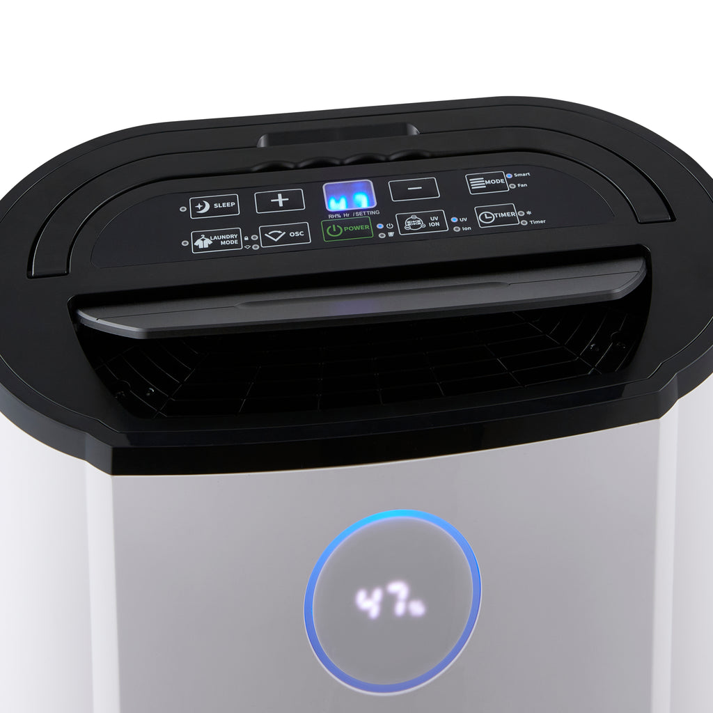 Create a healthier and more comfortable home environment with our PureFresh 12L Dehumidifier. This home dehumidifier is perfectly suited for rooms up to 24m², such as master bedrooms and living spaces, this dehumidifier also features an oscillating function that swings airflow between 45° and 90° for even moisture removal. Enjoy personalised dehumidifying with the convenient on/off timer that can be set from 1 to 24 hours, and a clear control panel ensures a user-friendly experience. Plus, we are pleased to tell you that this dehumidifier also cares for the planet! By utilising R290, it operates with a very low Global Warming Potential (GWP) and zero Ozone Depletion Potential (ODP), making it a more sustainable choice compared to traditional refrigerants. Designed with multiple functions to maintain your ideal comfort level such as a laundry function dedicated to speeding up indoor drying as well as a smart function that automatically adjusts operation based on humidity levels. The UV light destroys germs and bacteria, greatly improving indoor air quality and ION function refreshes the air while killing viruses, dust mites,