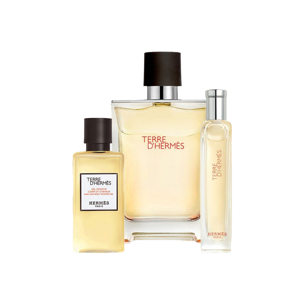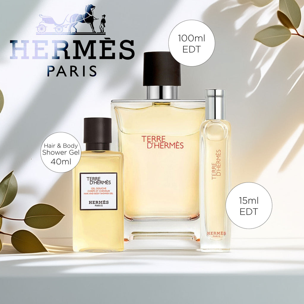 Hermès Terre D'Hermès 3 Piece Gift Set for men includes the classic Eau De Toilette in two sizes (100ml and 15ml) along with a refreshing Hair and Body Shower Gel (40ml). The fragrance opens with bright and zesty orange and grapefruit, creating a fresh and citrusy start. The middle notes reveal a warm and spicy heart with pepper, pelargonium, and flint, adding depth and complexity. The base notes of vetiver, cedar, patchouli, and benzoin provide a grounding, woody finish, making this fragrance both earthy and sophisticated. This set offers a full sensory experience, perfect for enjoying the iconic scent from head to toe.