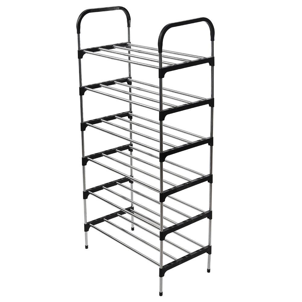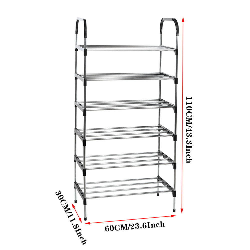 This tiered floor-standing shoe rack is ideal for keeping any room tidy. Its minimalist metal frame is both lightweight and durable. The slatted design allows air to circulate, helping to keep shoes dry and fresh. Easy to assemble with no tools needed.