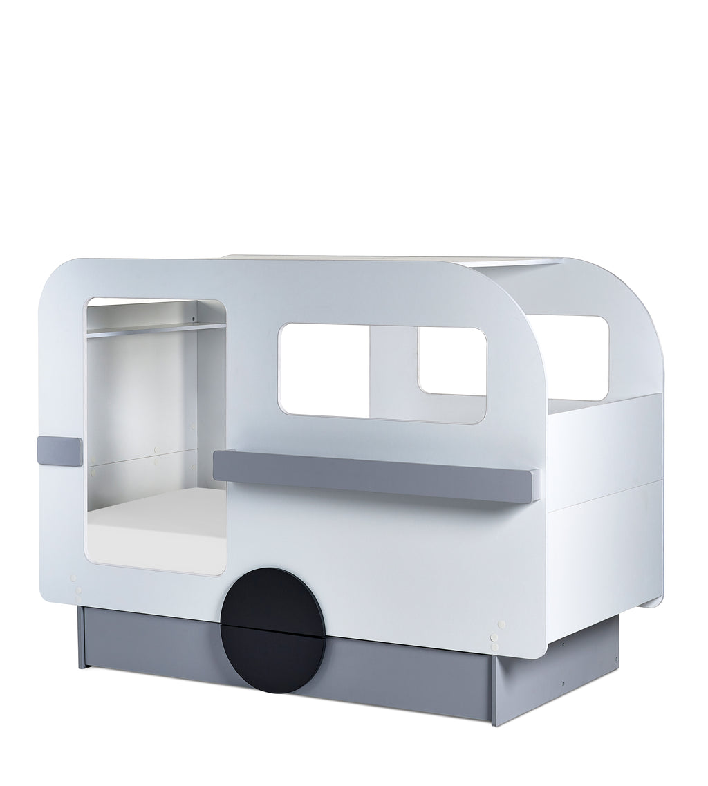 Explore the wonders of childhood with a unique Caravan-shaped bed, igniting your little one's imagination. Enjoy convenient storage with shelves inside and at the front, along with a pull-out drawer at the bottom, keeping books, toys, and essentials neatly organised. Ideal for playtime and bedtime, this bed provides a versatile space for adventure and relaxation. The lacquered white, grey, and black round-shaped wheels add a touch of modern elegance to the room. Crafted for both comfort and convenience, the Tourer Cavan Bed is a delightful addition to create lasting memories for your child.