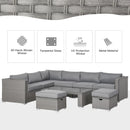 Bring comfort to your outdoor times with this Outsunny garden rattan furniture sets. Formed of three double corner sofas, a long coffee table and two footstools. Aluminium makes the frame of the rattan garden furniture for a strong structure, wrapped in UV and fade resistant PE rattan, so each piece of the conservatory furniture is durable and suitable for outdoor use. Each piece of the garden furniture sets finished with cushion s for comfort.