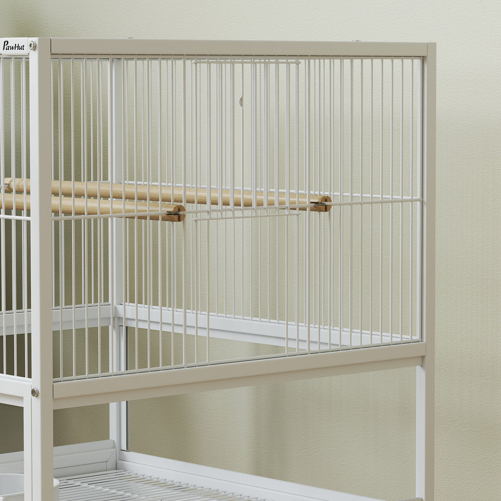 Give your birds a spacious, secure and stylish home with this thoughtfully designed cage. Featuring spill-proof 14cm acrylic panels, it keeps food and debris contained, while a removable tray and grid ensure effortless cleaning. Wide wooden perches and large feeders provide comfort and the 1.2cm bar spacing prevents escapes. A lower storage shelf keeps essentials organised and smooth-rolling wheels with brakes allow easy movement. Suitable for homes and vet clinics!