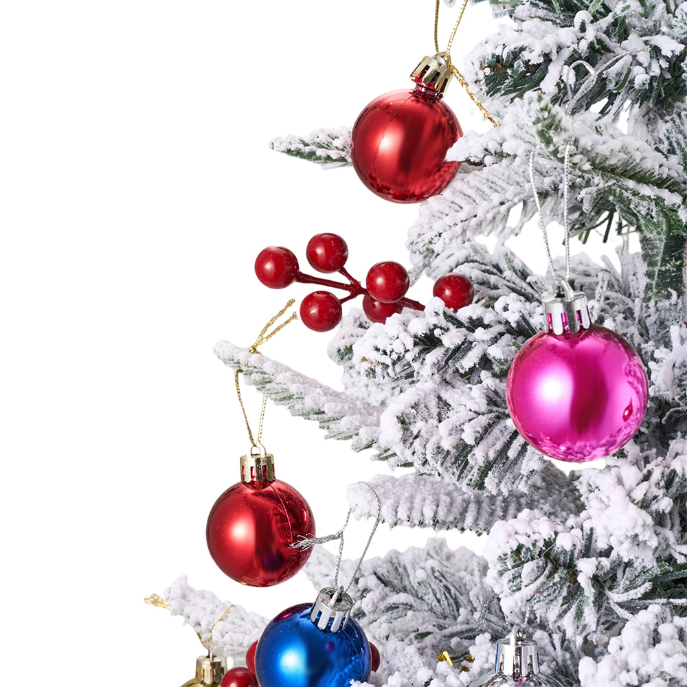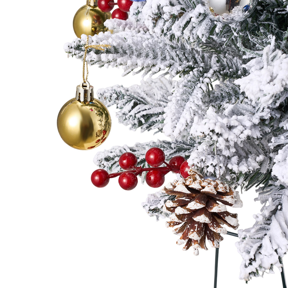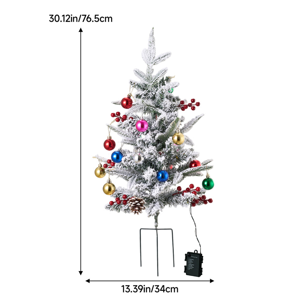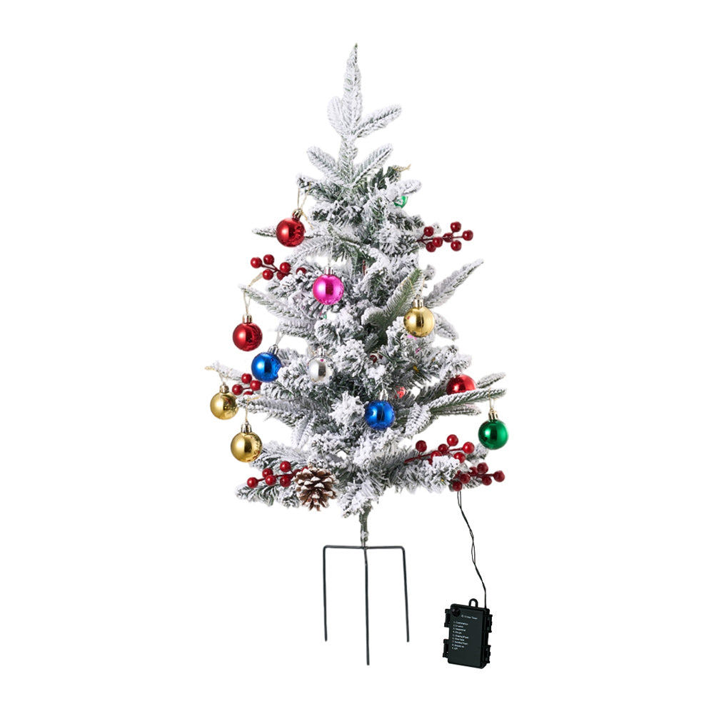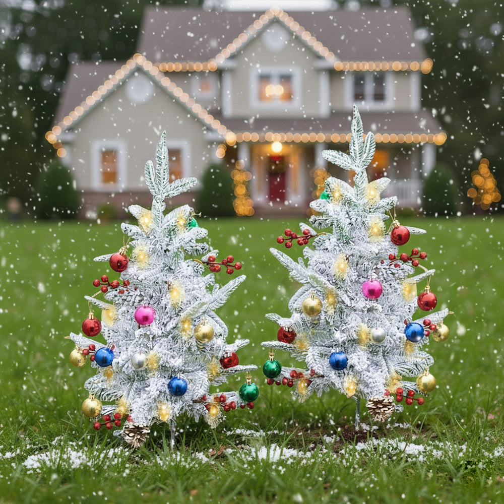 Enhance your outdoor decor with this 2-pack of Christmas trees. Each tree is equipped with a sturdy metal tripod stake, allowing easy placement in soil, planters, or floral foam for a secure display in gardens, patios, or doorways. Decorated with colourful baubles, clusters of red berries, and realistic pinecones on snow-dusted branches, they bring a touch of winter magic to your space. Compact and weather-resistant, these trees are perfect for adding festive cheer to your porch, front entrance, or garden, creating a warm and welcoming holiday atmosphere all season long.