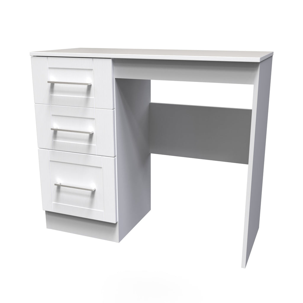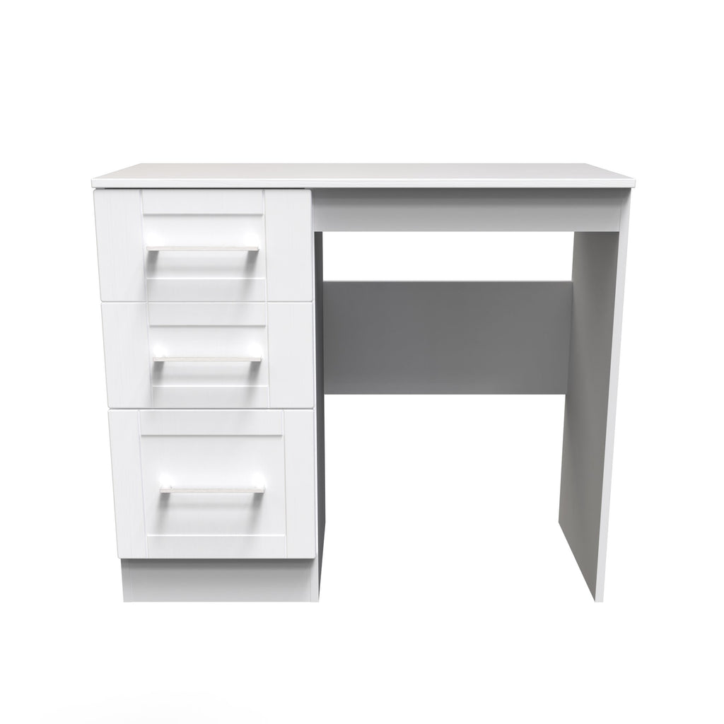 (Dimensions: H80 x W90 x D39cm) This practical 3 drawer narrow desk/vanity is perfect for any bedroom or office. A matching stool and mirror (in 2 sizes) are also available. Wood grain effect, panelled design, recessed fronts and chrome handles, the York Range is a beautifully elegant collection. With this range you have the freedom to choose from a wide range of furniture configurations, allowing you to create the perfect combination to optimise your storage space. All our furniture is made in the United Kingdom, to the highest quality. It is delivered direct to your location of choice by one of our two man delivery teams, and comes fully assembled (although legs may be removed to prevent damage in transit).