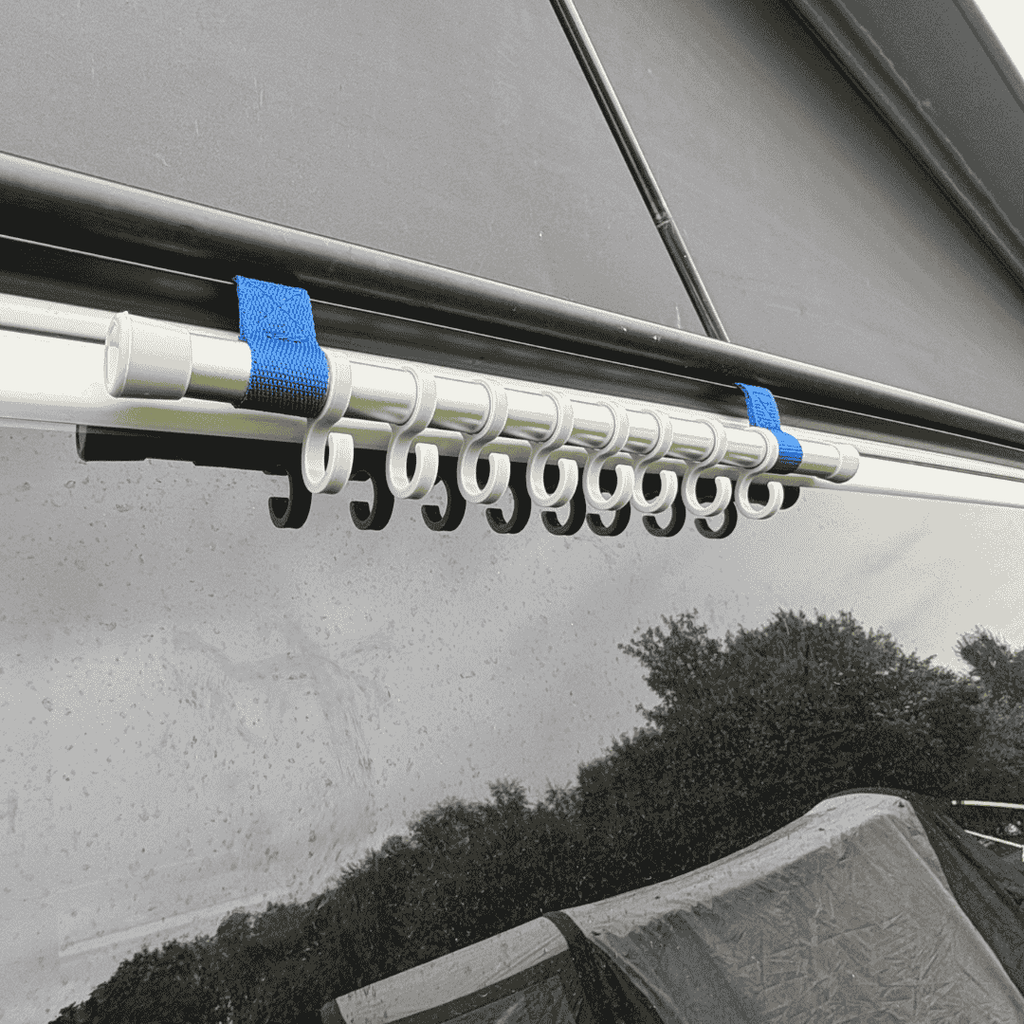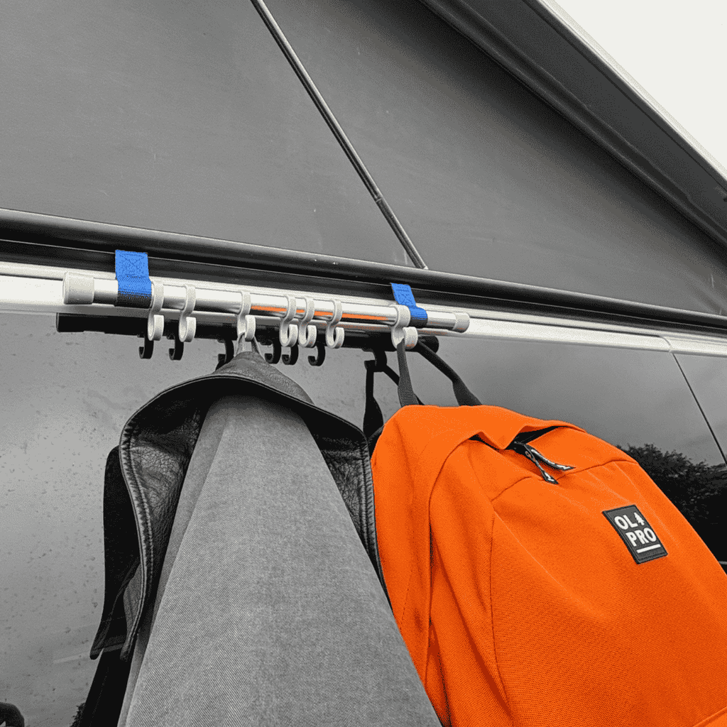 Keep your outdoor space organised and clutter-free with the OLPRO Awning Rail Hanger – the perfect storage solution for caravans and campervans. This handy accessory simply slides into the 6mm awning channel on the outside of your vehicle, providing eight sturdy hooks to hang coats, towels, dressing gowns, dog leads, or even wet swimming gear. Designed for convenience and space-saving practicality, the Awning Rail Hanger helps keep your inner living area dry and tidy by letting you air or store items outdoors — ideal after a day at the beach or a muddy walk with the dog. Whether you’re camping by the coast, touring in your caravan, or enjoying a festival weekend, the OLPRO Awning Rail Hanger is a simple yet game-changing accessory for keeping your essentials neat and accessible. Compact, lightweight, and easy to install — it’s a must-have for every campervan setup. Suitable only for awning rails or C-channels with 6mm beading. Please check your vehicle’s rail size before purchase. Key Features of the OLPRO Awning Rail Hanger: Easy Slide-In Design – Fits securely into your caravan or camper’s external awning rail 8x Strong Plastic Hooks – Perfect for hanging clothes, towels, swimming gear, or dog leads Durable Aluminium Pole – Lightweight yet sturdy for long-term outdoor use 2x 6mm Keder Strips – Ensure a snug, stable fit in your awning channel Space-Saving Storage – Keeps your items organised without cluttering up the interior Weather-Resistant Build – Designed to withstand outdoor use on your travels Made from/with: 1x Aluminium Pole + ABS 8x Plastic Hooks 2x 6mm Keder Strips Specifications: Total length: 40.5cm Pole diameter: 20mm Pole thickness: 2mm