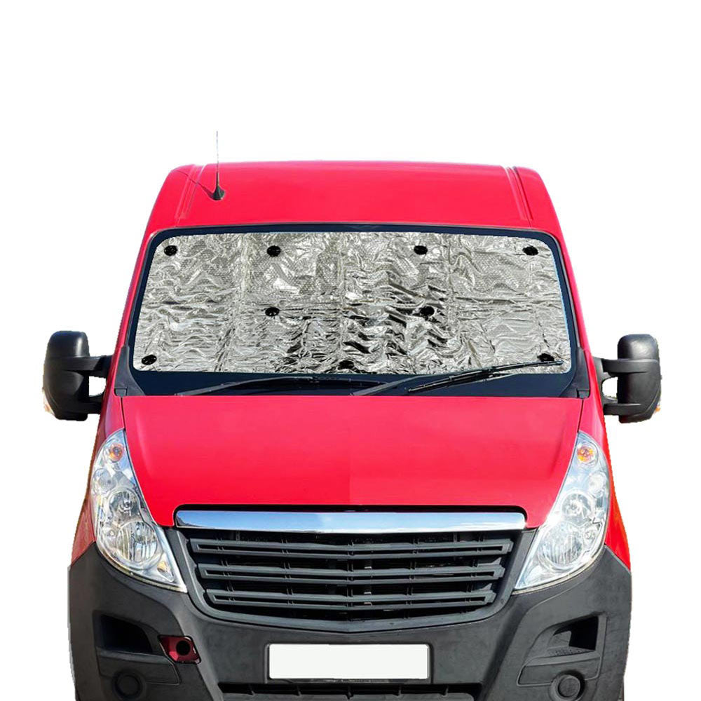 OLPRO's Internal Thermal Blinds are tailored for the Renault Master, Vauxhall Movano (Opel Movano), Nissan Interstar (NV400) campervans and vans. The three piece set covers the front windscreen and the two front cab side windows and features a stylish blue trim. They're easily fitted with the suction cups provided. The set is perfect for privacy and will cool the campervan in hot weather and keep it warm in cold weather. This thermal blind set fits vans from 2010 onwards.