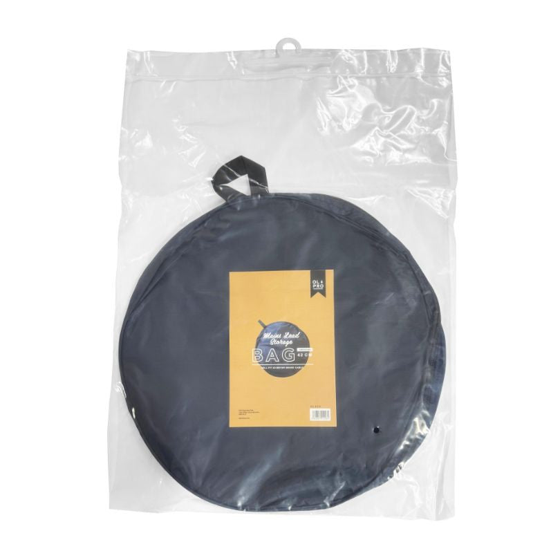 Quality mains lead storage bag for holding up to 25m of cable. 40cm diameter with zip fastener. Made from 420D Nylon with PU Coating .