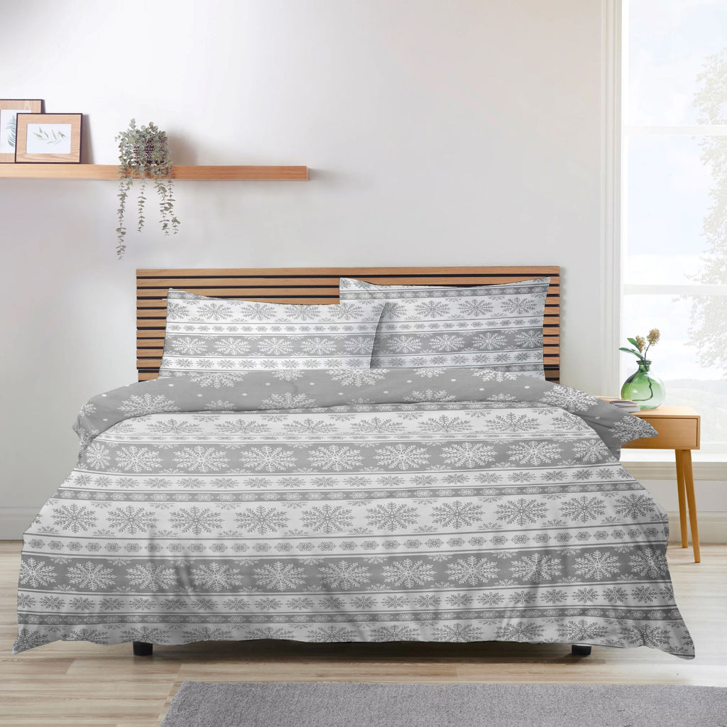 Experience the magic of Christmas this winter with this festive bedding set. Printed with grey snowflakes with a contrasting reverse, this duvet set is sure to add a classic and stylish look to your festive season.