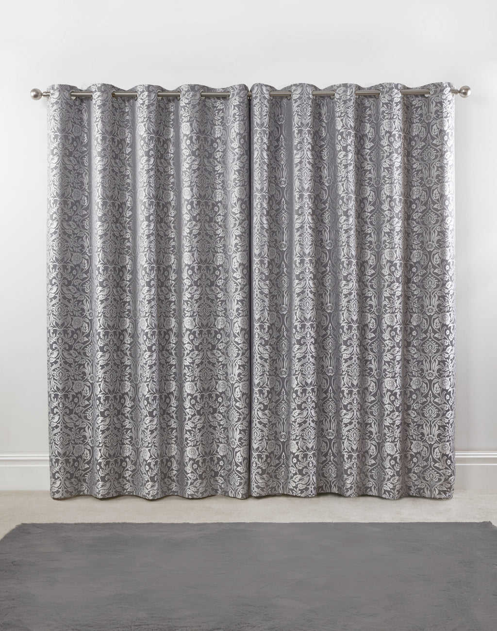 Luxurious lined eyelet curtain pair, with a soft sateen finish and an intricate floral trellis design. These stylish curtains are coloured in modern tones, with a light and whimsical traditional design. Perfect for a modern or traditional home.