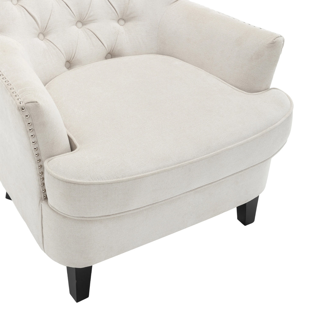 Whether your taste leans towards traditional charm or contemporary style, this classic linen armchair is a striking addition to any interior. Featuring a buttoned linen back and rivet edge detailing, it combines timeless elegance with excellent lumbar support. The generously padded seat and backrest provide superior comfort, while the high-quality linen upholstery ensures a soft and cosy seating experience.