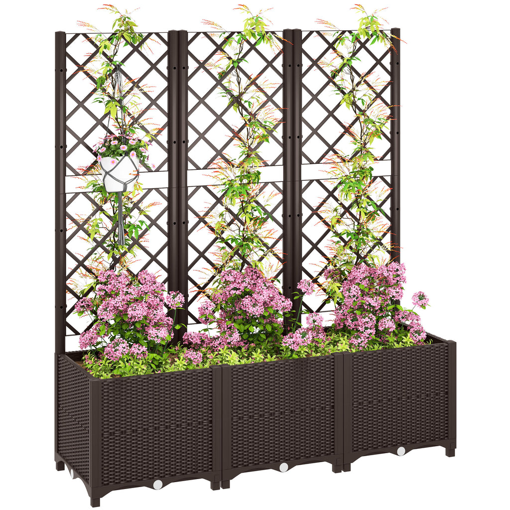 Transform your garden with the Outsunny Raised Planter with Trellis! This lightweight PP planter supports climbing plants splendidly, while its 8 drainage holes ensure optimal soil moisture. Suitable for both indoor and outdoor spaces, this garden bed is just what you need to cultivate lush flowers or vegetables. • Trellis supports climbing plants for vertical gardening options