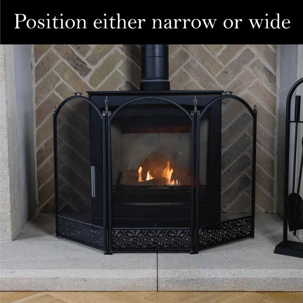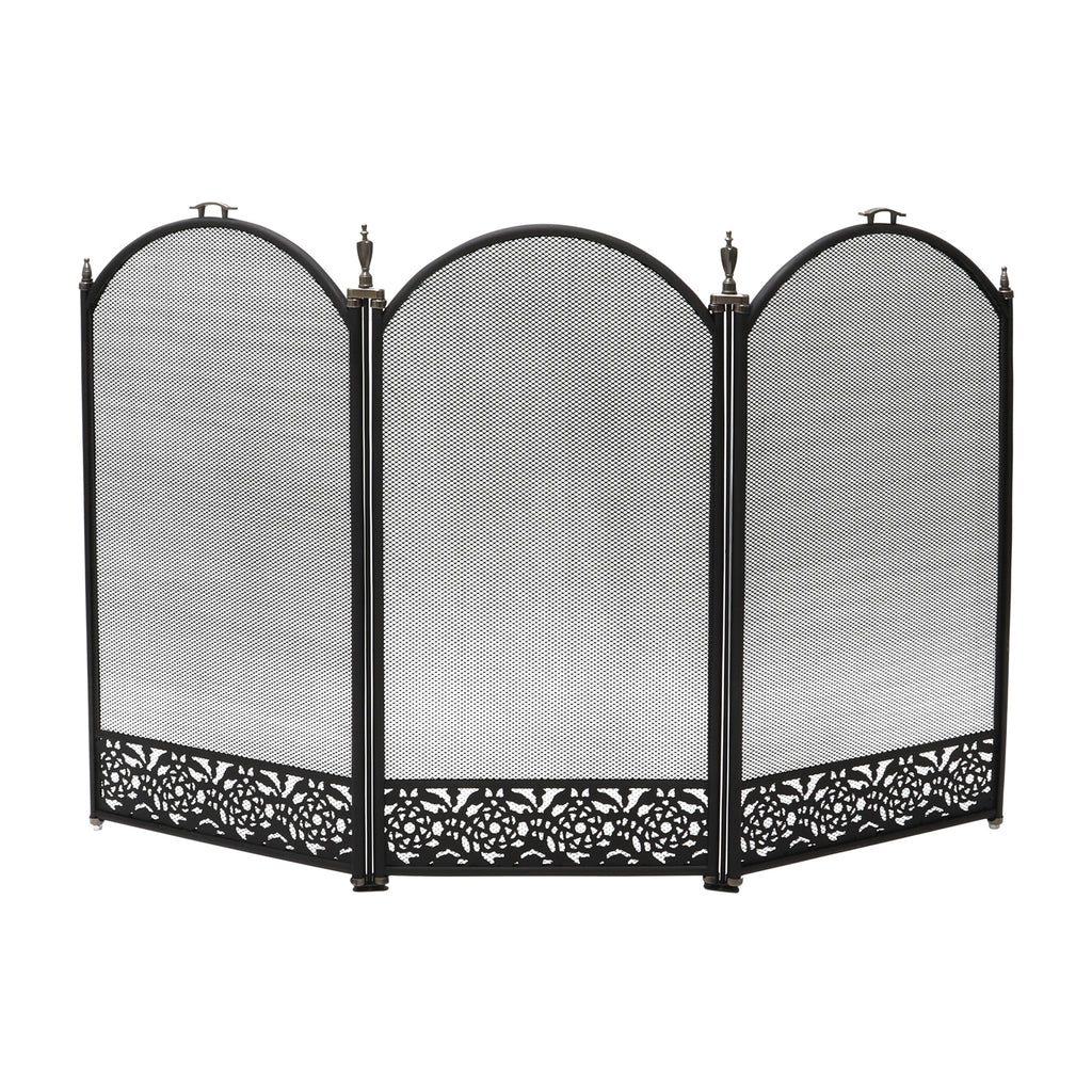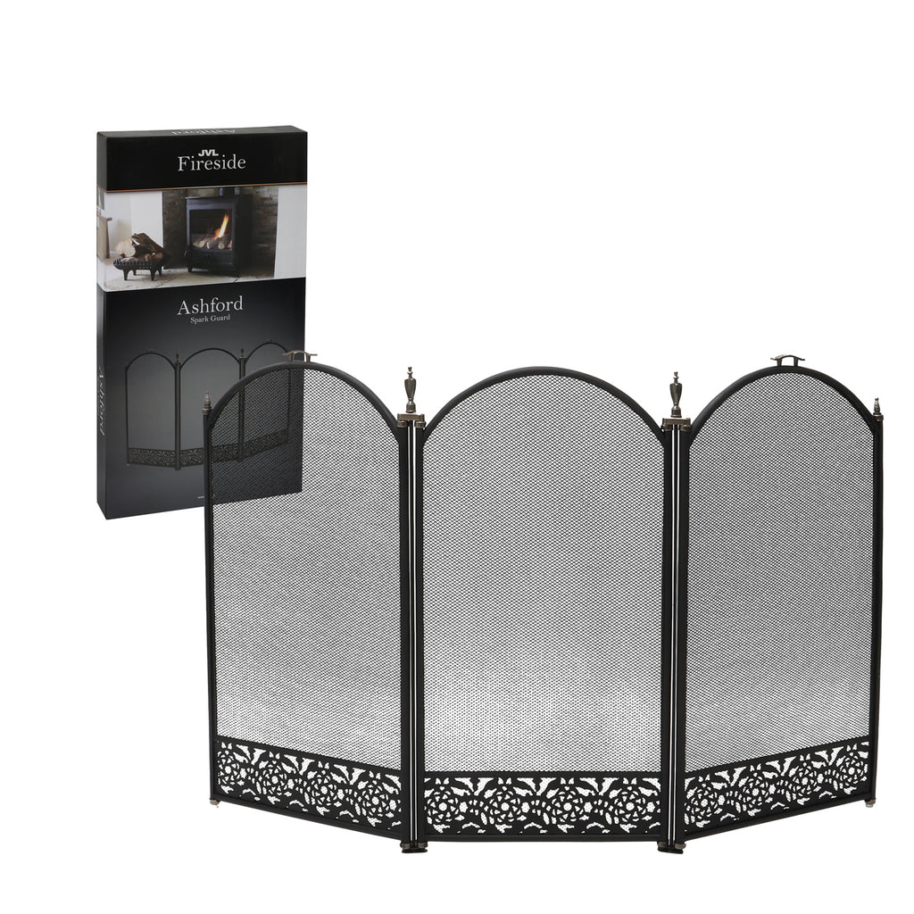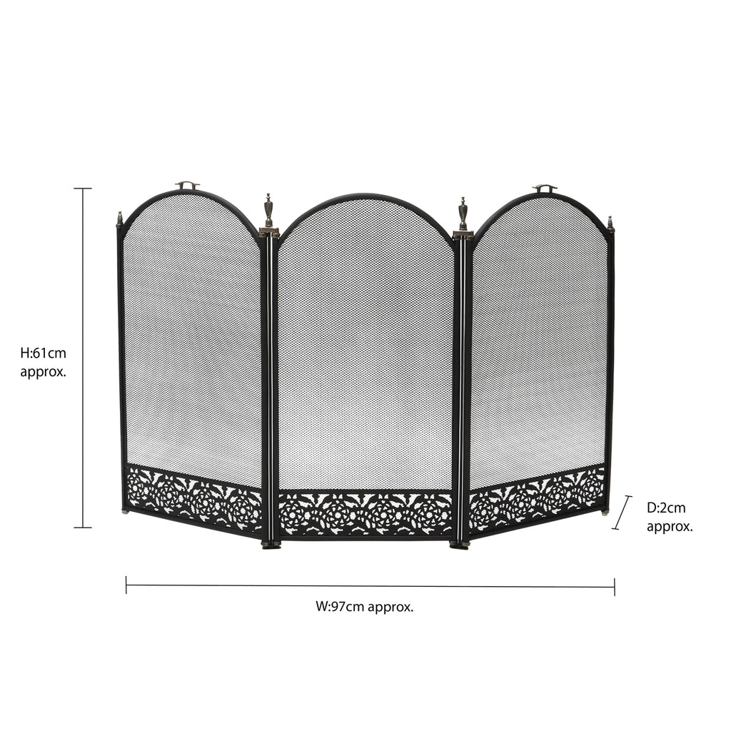 A classic three-fold design features a pretty pattern at the base with two decorative finials, along with its black powder coated finish making it stylish and practical, the perfect accessory for any fireplace