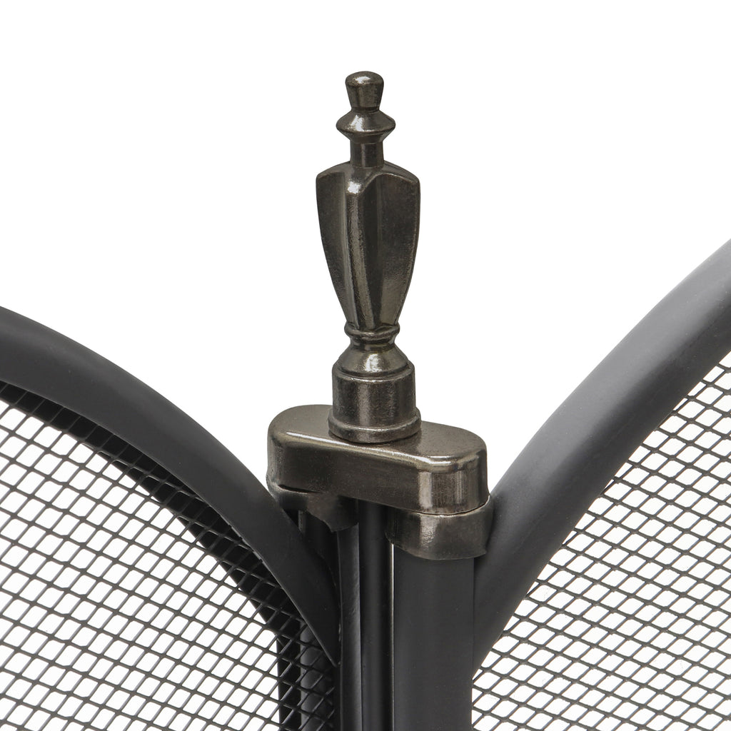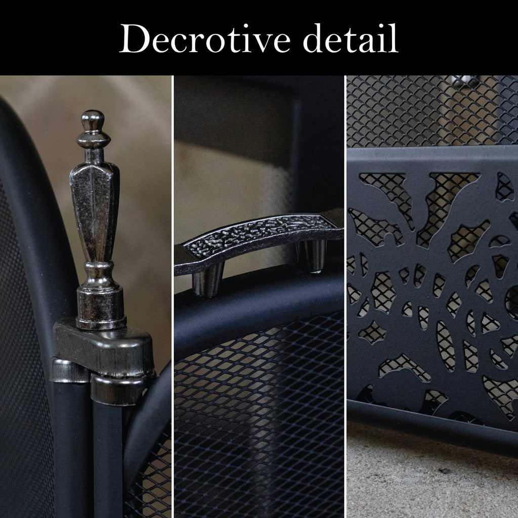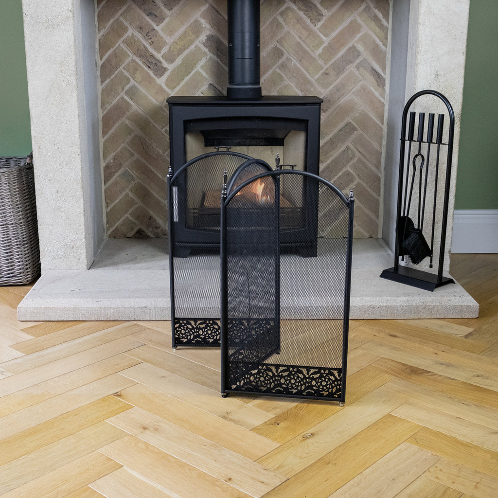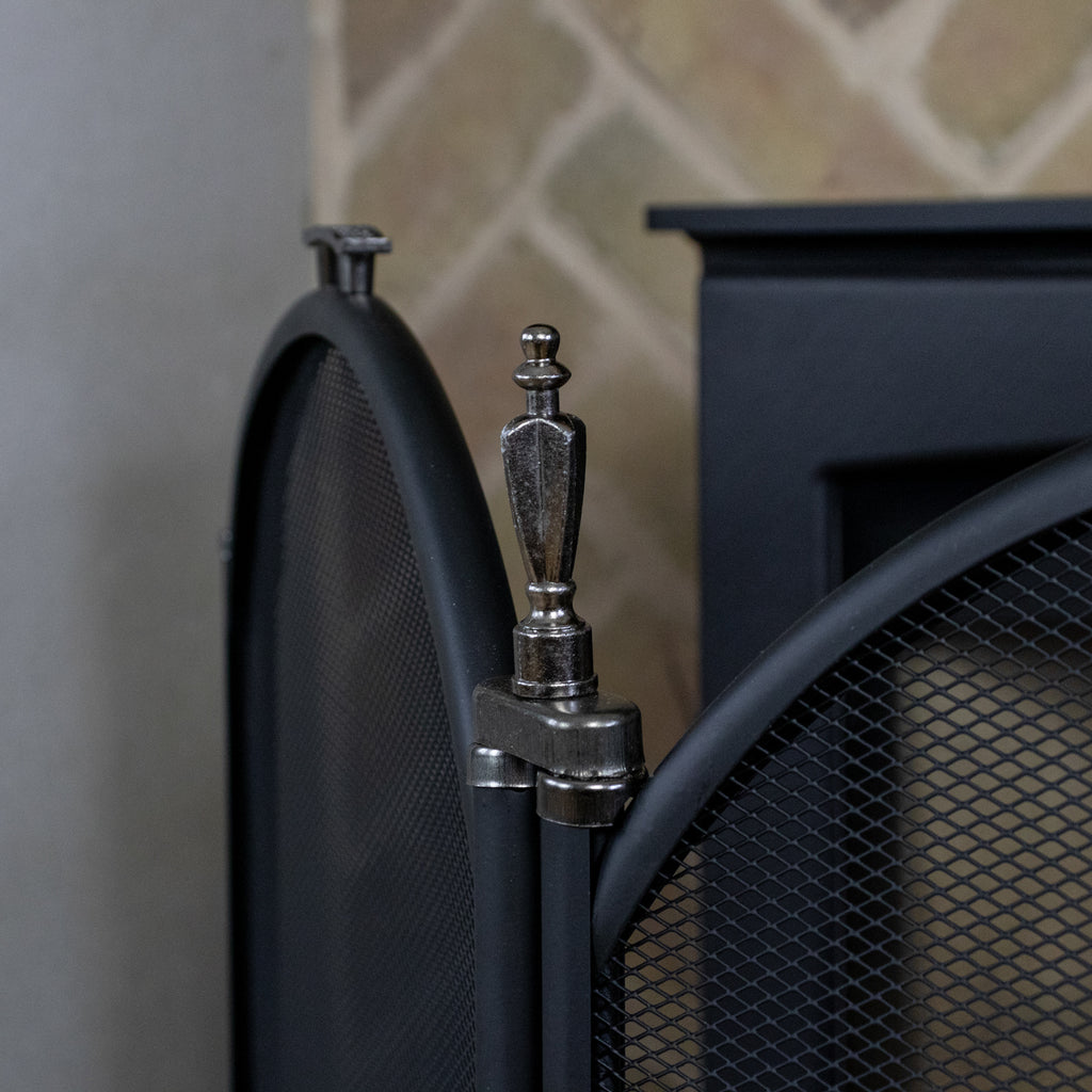 A classic three-fold design features a pretty pattern at the base with two decorative finials, along with its black powder coated finish making it stylish and practical, the perfect accessory for any fireplace