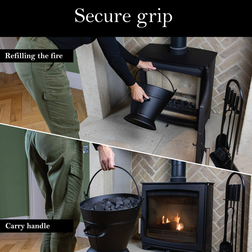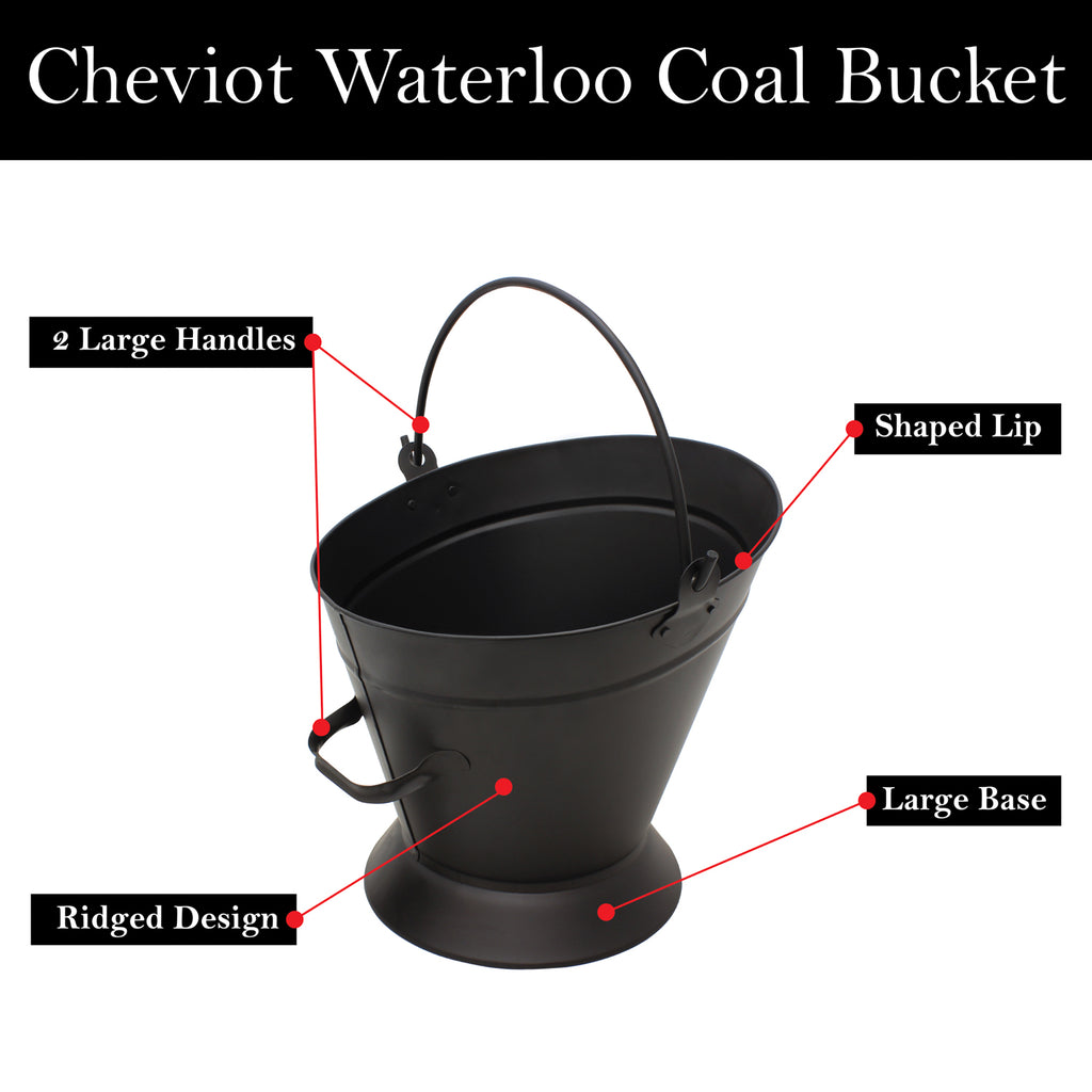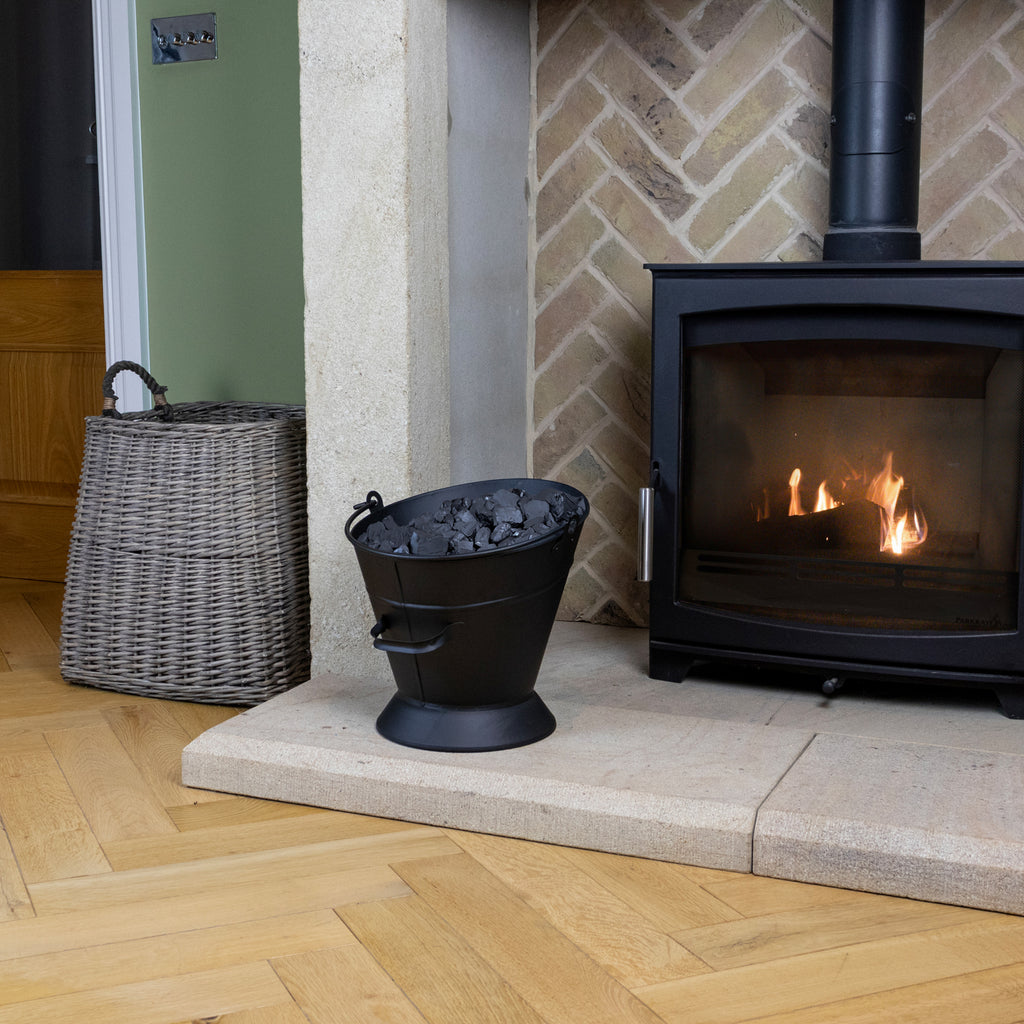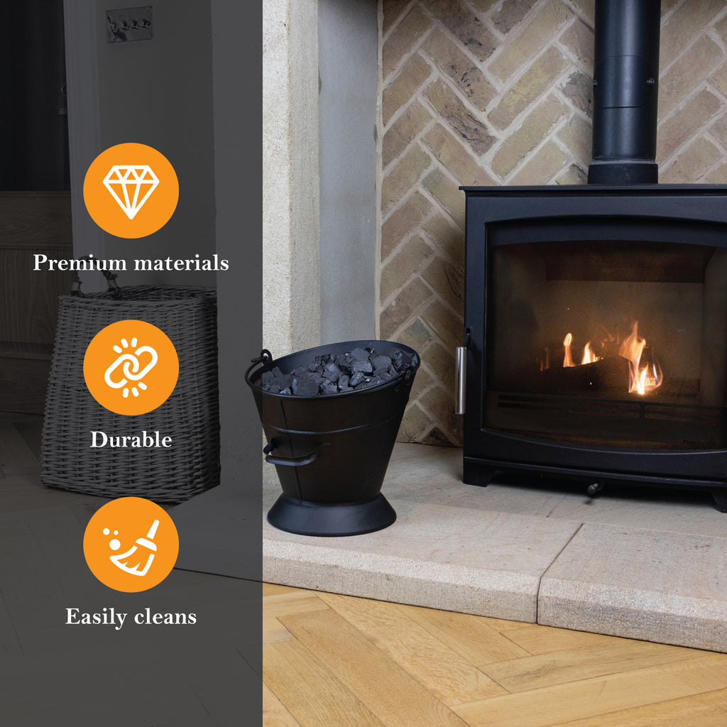 The fireplace is the heart of the home, that's why we have carefully selected a range of fireside furnishings matching function with style. Minimise the number of trips you need to make restocking coal for the fire with our Cheviot Waterloo Bucket. This traditional 14-inch coal bucket holds a large amount of coal and features two handles, one for ease of carrying and the other on the side working with the shaped lip to make scooping the coal and refilling the fire as easy as possible. The coal bucket is an ideal way to transport coal to the fireplace. Simple design with a visible ridge to add a little depth to this classic, yet functional fireside accessory, made from steel with a black powder coating for a sleek finish.