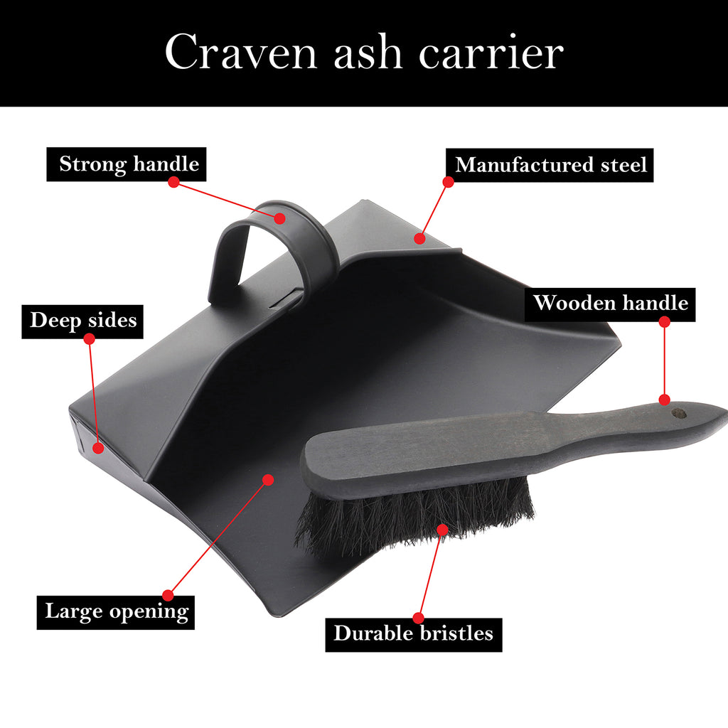 The fireplace is the heart of the home, that's why we have carefully selected a range of fireside furnishings matching function with style. The Craven Ash carrier Set is crafted from steel with a black powder coated finish. Taking the hard work out of cleaning your fire, ash carriers help you carry the cooled ashes away easily and the brush allows you to sweep away cooled coal dust, making it a great fireside accessory. This simple, classic design works with any setting, whether it be traditional or modern fireplace.