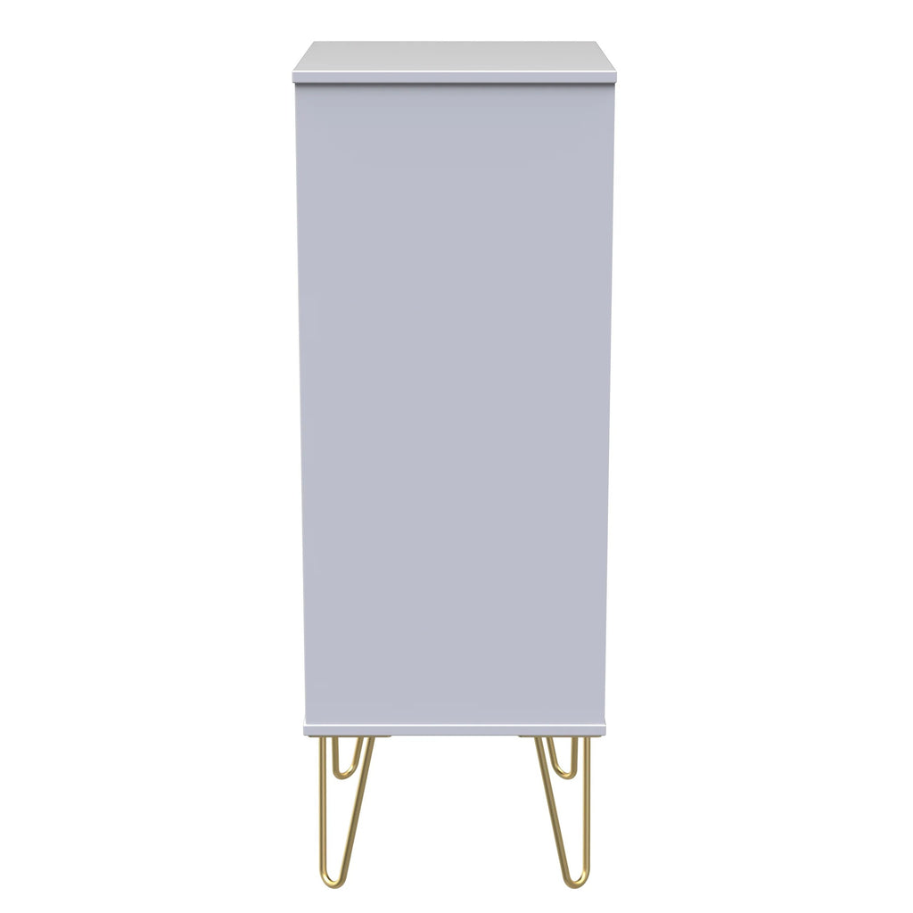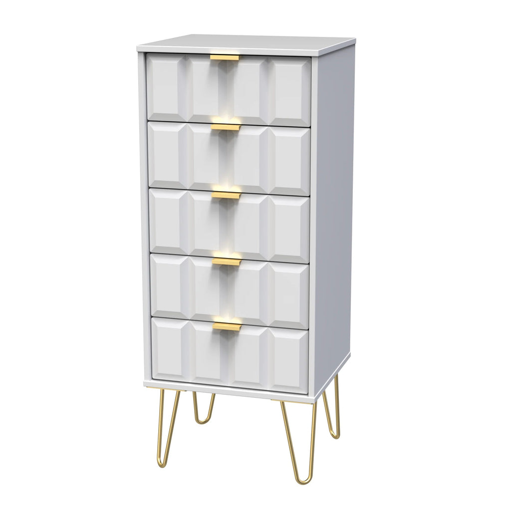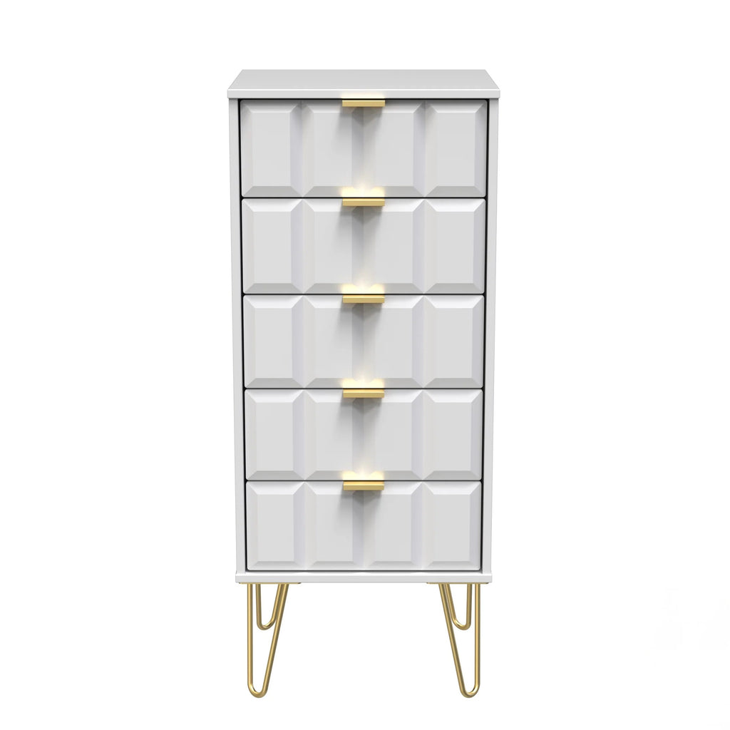 (Dimensions: H109 x W45 x D40cm) This 5 drawer chest of drawers is practical and stylish. Perfect for any home as a free standing storage unit. A modern and distinctive range. Named for the unique "Cube" patten of the drawer and door fronts. Also features Gold Metal Handles and Gold Hairpin Legs. Comes in a wide range of colours including eye cathching two tone colour combinations. All our furniture is made in the United Kingdom, to the highest quality. It is delivered direct to your location of choice by one of our two man delivery teams, and comes fully assembled (although legs may be removed to prevent damage in transit).