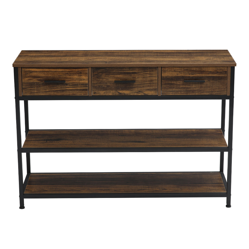 The Vintage Console Table with Drawers adds charm and practicality to your living room, hallway, or bedroom. Its three drawers provide convenient storage for essentials, while two open shelves offer space for decorative items or additional organisation. Crafted from rustic wood with a sturdy metal frame, it combines warmth with durability. The dark brown top and black frame create a stylish vintage-industrial look that complements any interior. Ideal for displaying artwork, vases, or personal items, this console table is both functional and decorative.