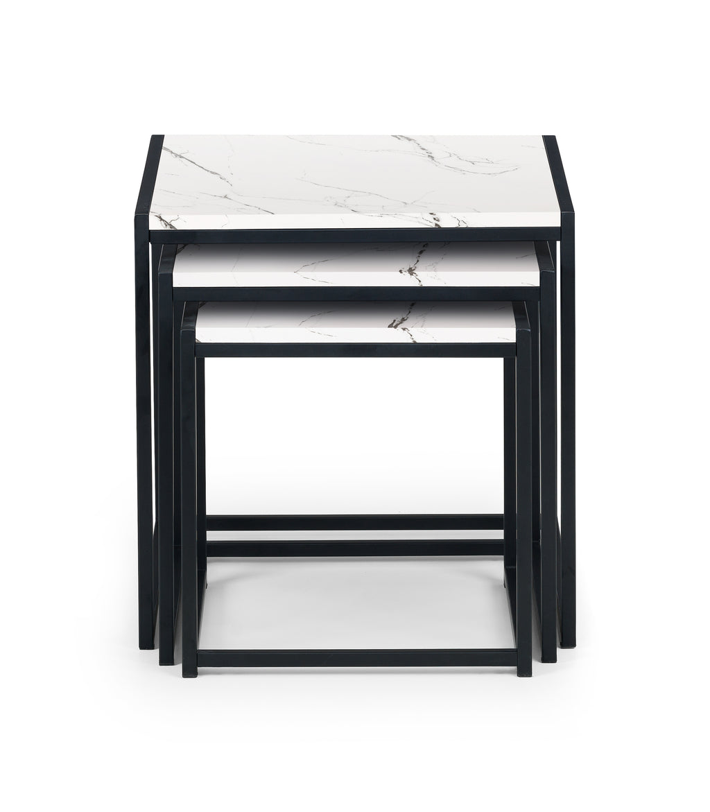 A cool, modern nest of tables designed to add a contemporary touch to any home or work place. Its simple clean lines, delineated by a subtle, black coated metal frame are complemented perfectly by a modern, white marble foil, to create a very stylish and sleek product.