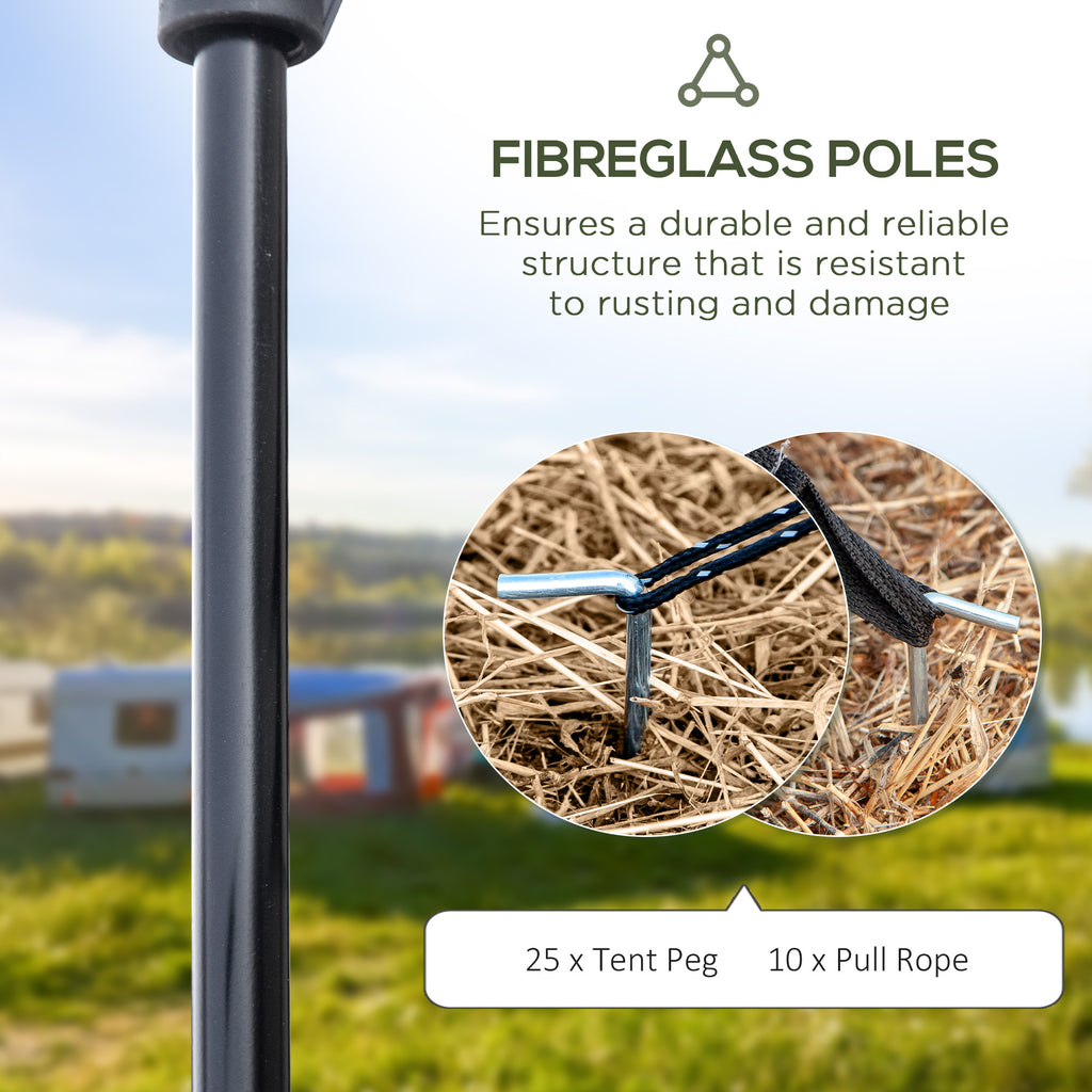Camping number restrictions need not apply: this Outsunny 5-6 man tent provides plenty of sleeping and socialising room for outdoor adventures. Using fibreglass poles for a shape which stays in shape, it's fitted with a 2000mm water-resistant polyester canopy to shield you inside safely. The side and front windows provide increased airflow and allow you to see outside/inside easily. The inner room is removable - create a single room space, or keep it separated when required.