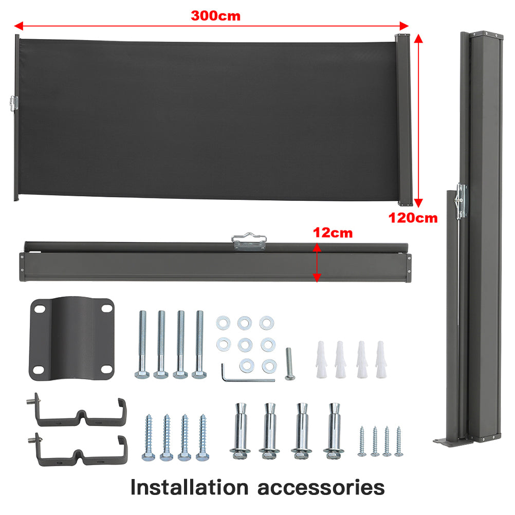 The Garden Sanctuary outdoor retractable side awning offers a stylish and practical solution for enhancing privacy on your patio or balcony. Designed to shield your space from view, it features a durable aluminium alloy frame with a sturdy steel support pole, both resistant to rust and ideal for long-term outdoor use. The awning is easy to extend and retract by hand, allowing you to make the most of your space whenever needed. Enjoy a more private and comfortable outdoor setting with this sleek and functional addition.