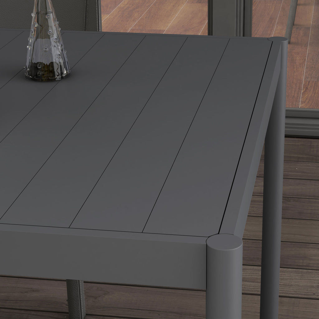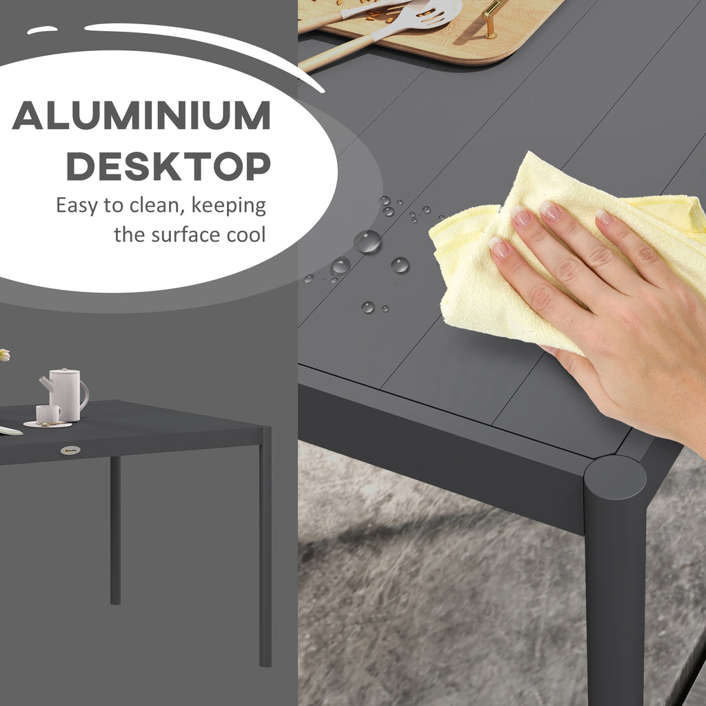 Gather your loved ones around this six-seater Outsunny garden table. Crafted from powder-coated aluminium and steel, it boasts durability and features a slatted tabletop design to prevent water accumulation. Suitable for family and friend gatherings.
