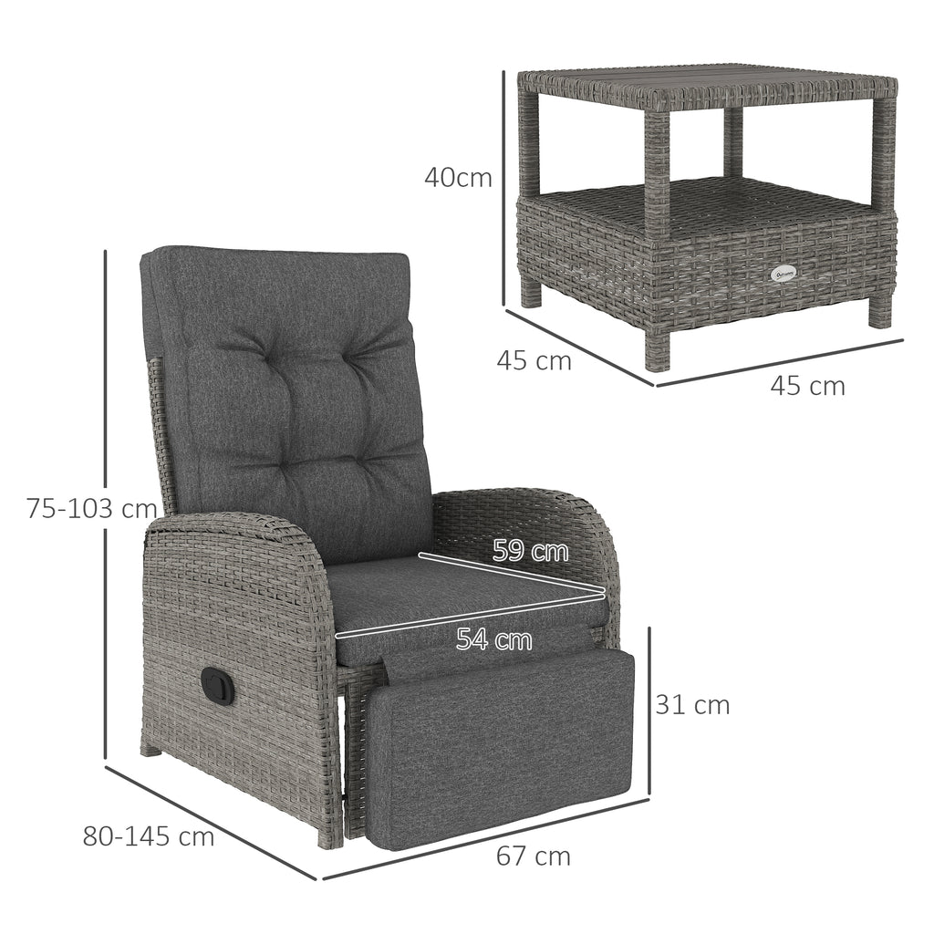 Unrivalled comfort for the garden and beyond with this Outsunny garden furniture set. Powder coated aluminium frames mean a strong core, wrapped in stylish plastic rattan - a protective shell. The two chairs feature a reclining back, maximum 150° angle, with footrest to elevate your lower body. The rattan bistro set is complete with a two-tier table for a handy holding spot.