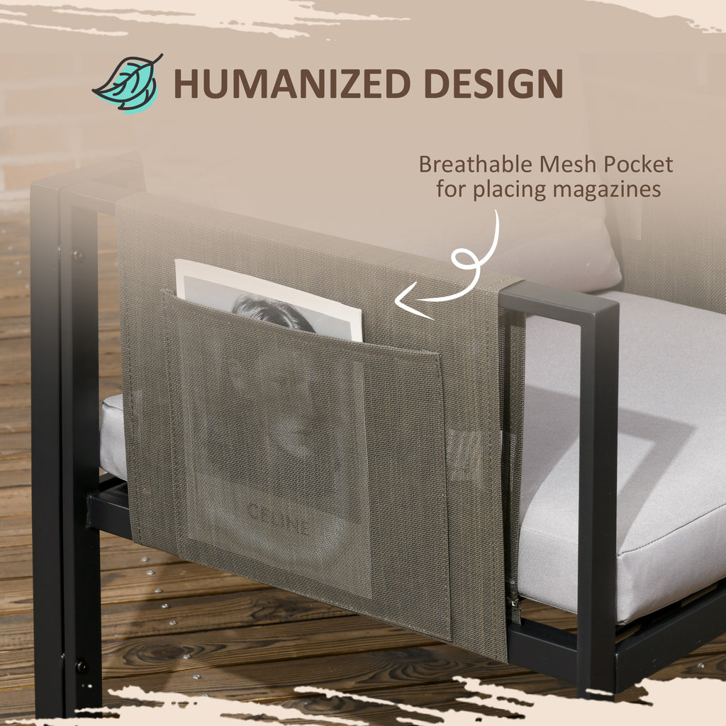 Let friends and family gather in a simple yet sleek style outdoors, thanks to this Outsunny set. Four pieces û two armchairs, a two-seater sofa and a coffee table - seats up to four people. Each frame is made from steel: strong and supportive. Thick padded cushions on the seats and backs for comfort. Comes complete with a tempered glass-top table.
