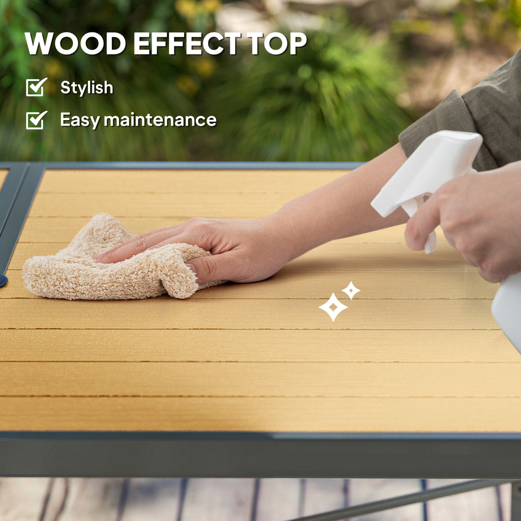 Discover the charm of al fresco dining with the Outsunny garden dining table, designed to seat six comfortably. Featuring a wood-effect galvanised steel top and a robust steel frame with a powder-coated finish, this outdoor table ensures style and stability. It's also equipped with an umbrella hole, suitable for sunny or rainy days in your garden or patio.