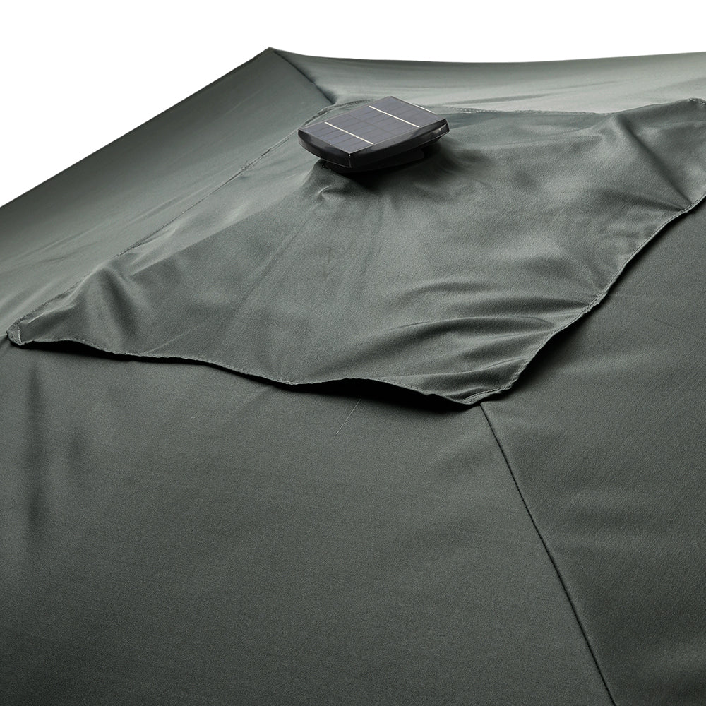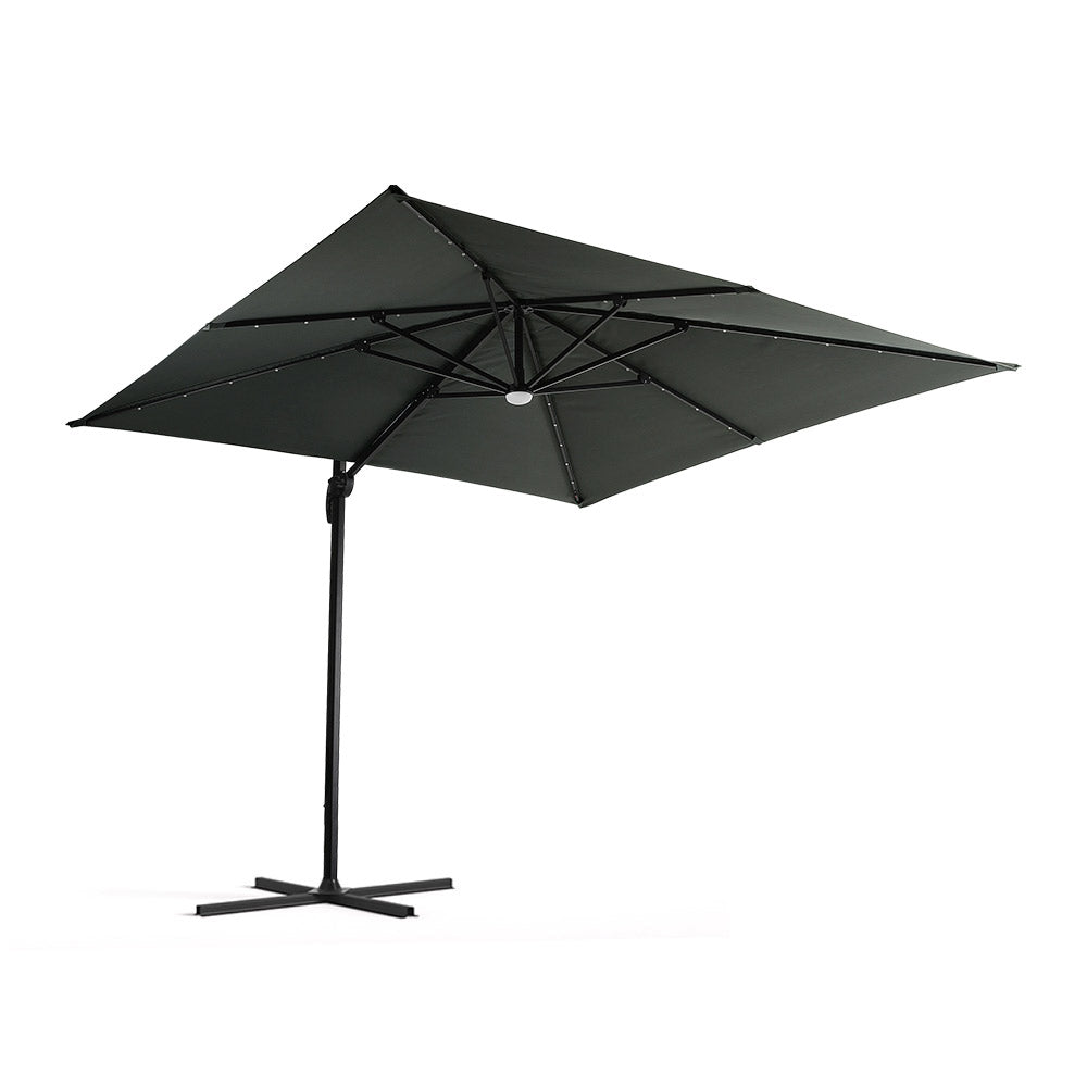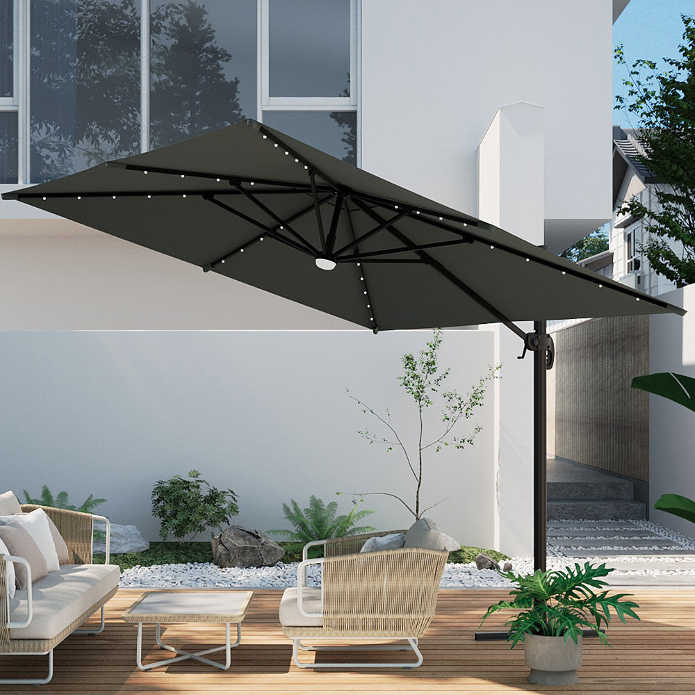 Enjoy stylish protection from the sun with the Garden Sanctuary Cantilever Parasol. Featuring a strong metal frame and a square canopy made from weather-resistant polyester, this parasol is built to endure various outdoor conditions while providing ample shade on sunny days. The crank mechanism and adjustable handle make it easy to tailor the angle of shade to your preference. With a 360-degree rotating base, you can effortlessly reposition the parasol without moving the entire structure. For added ambience, each rib is fitted with solar-powered LED light beads, allowing you to enjoy your outdoor space well into the evening.