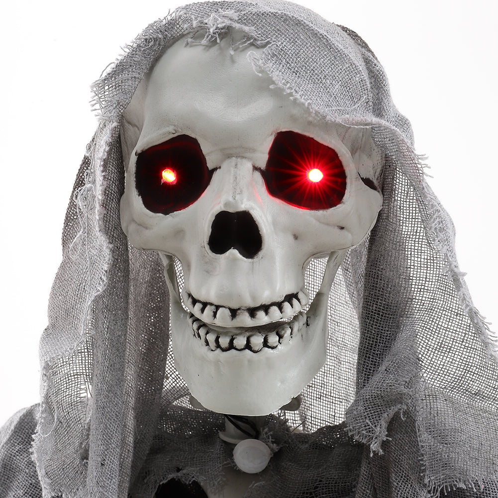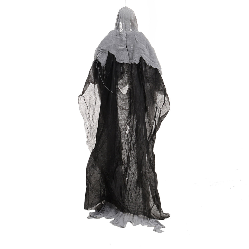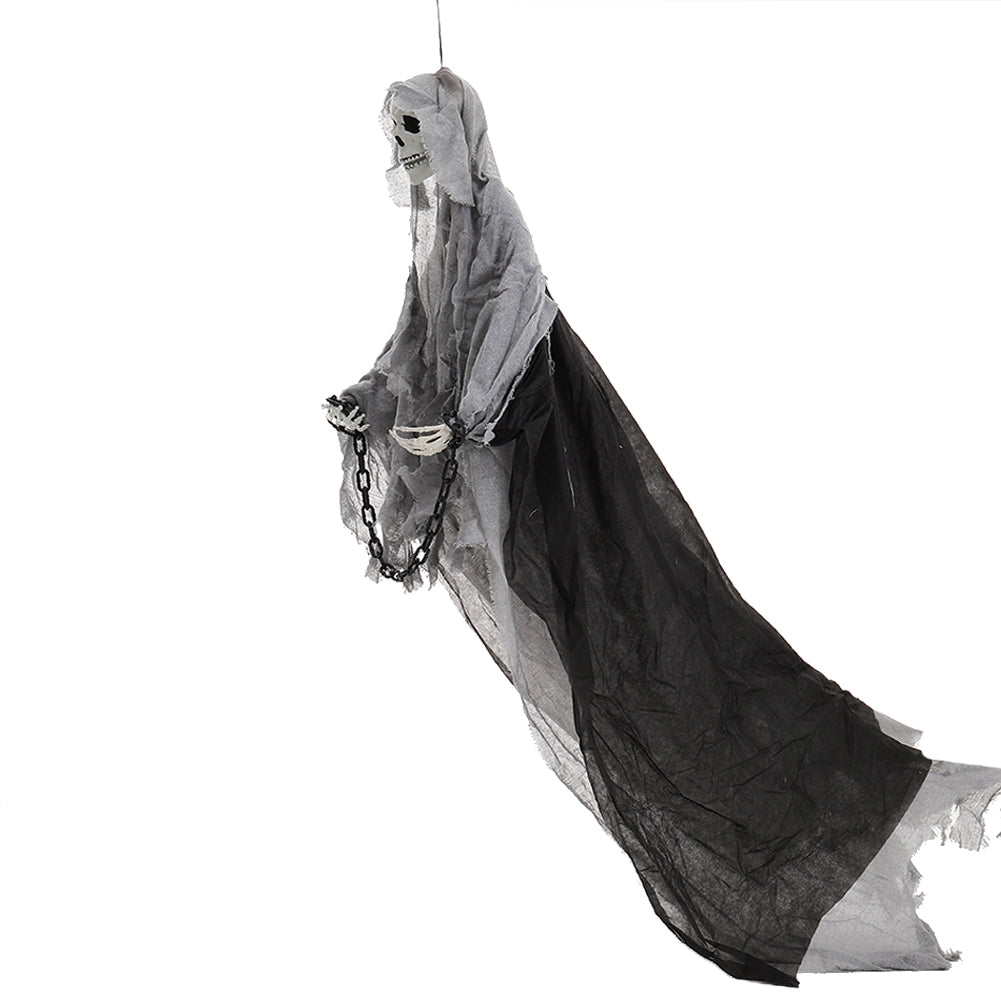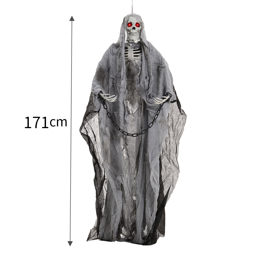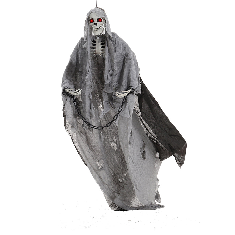 Standing 171 cm tall, this skeleton ghost is a timeless Halloween decoration that never goes out of style. Dressed in ragged clothing with chained hands, its skull gazes silently from the shadows. When approached, its eyes glow a menacing red and it emits a chilling sound, sure to make you shiver. Perfect for Halloween and equally suited to any event needing a spine tingling atmosphere, this prop is a must have for your spooky display.