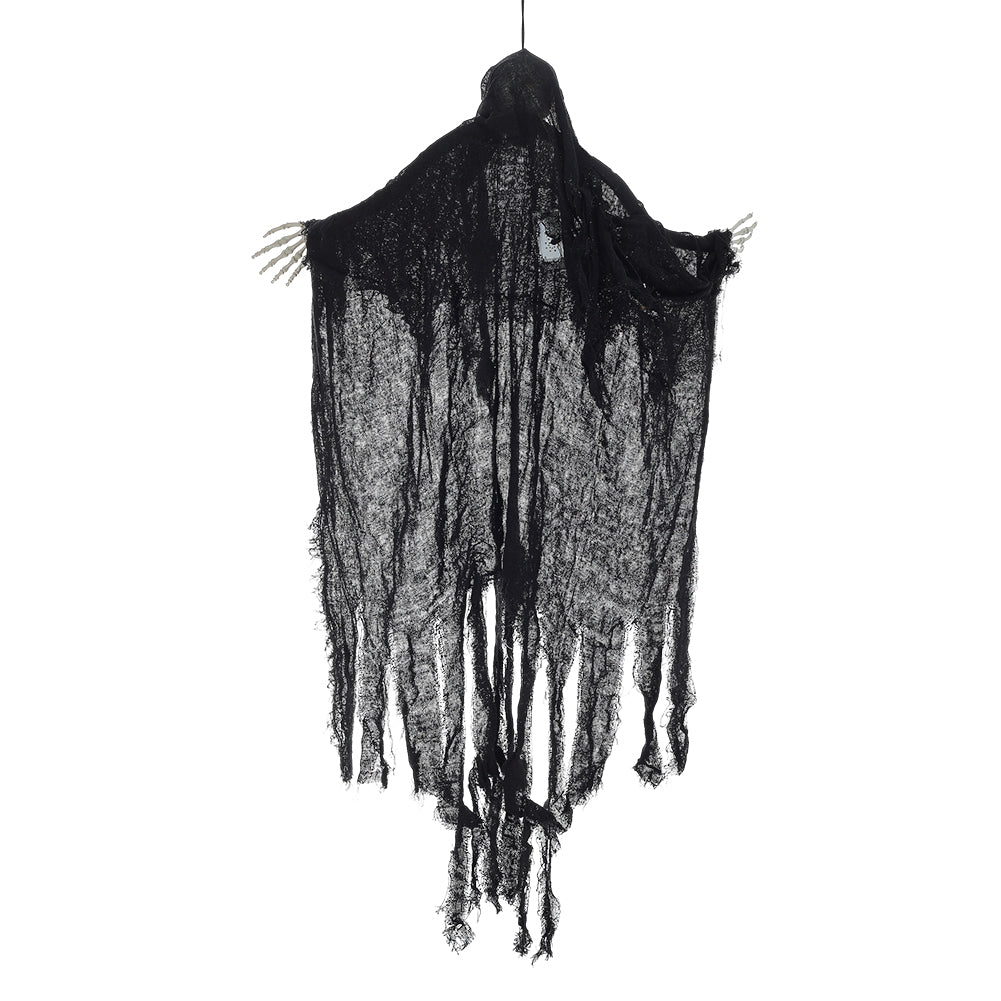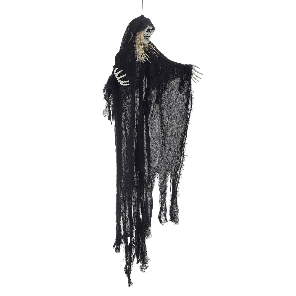This Hanging Skeleton Ghost is sure to spook all visitors. Standing 120cm tall, it wears tattered robes that move eerily in the breeze. An infrared sensor triggers a chilling scream and glowing eyes when anyone approaches. Ideal for your porch, garden, or haunted house this Halloween.