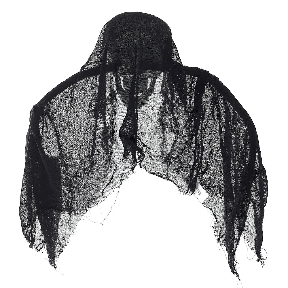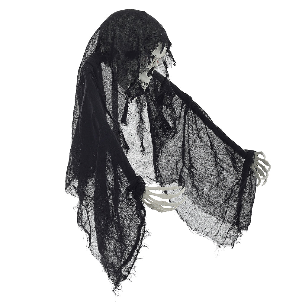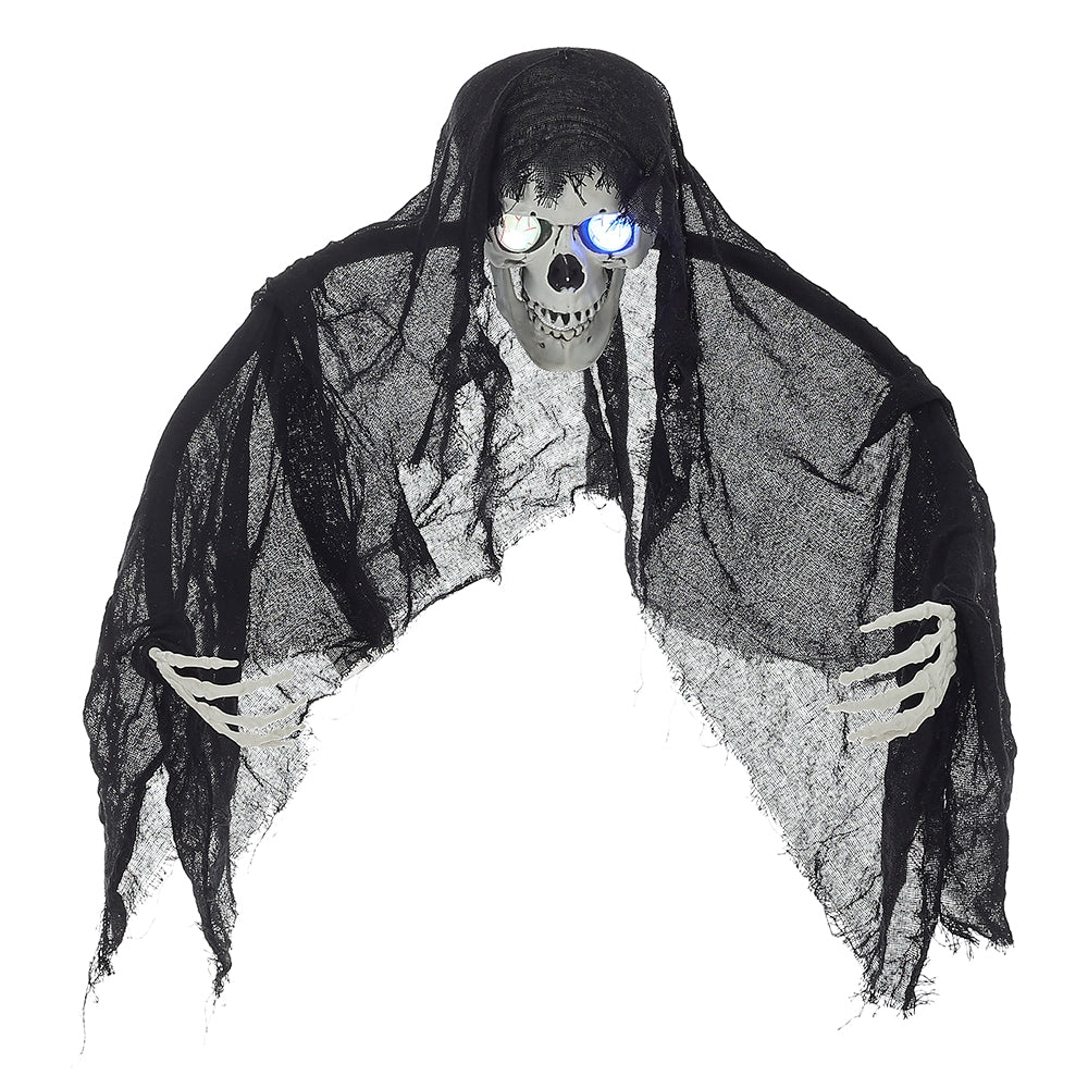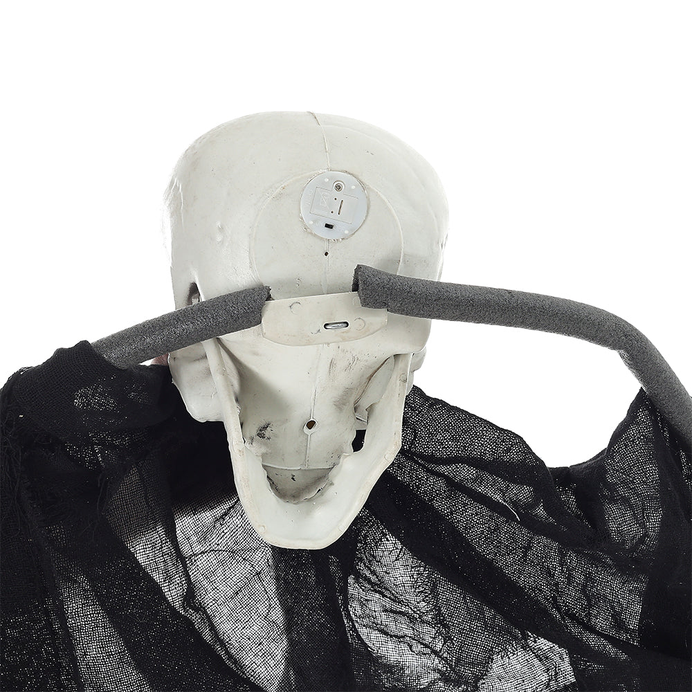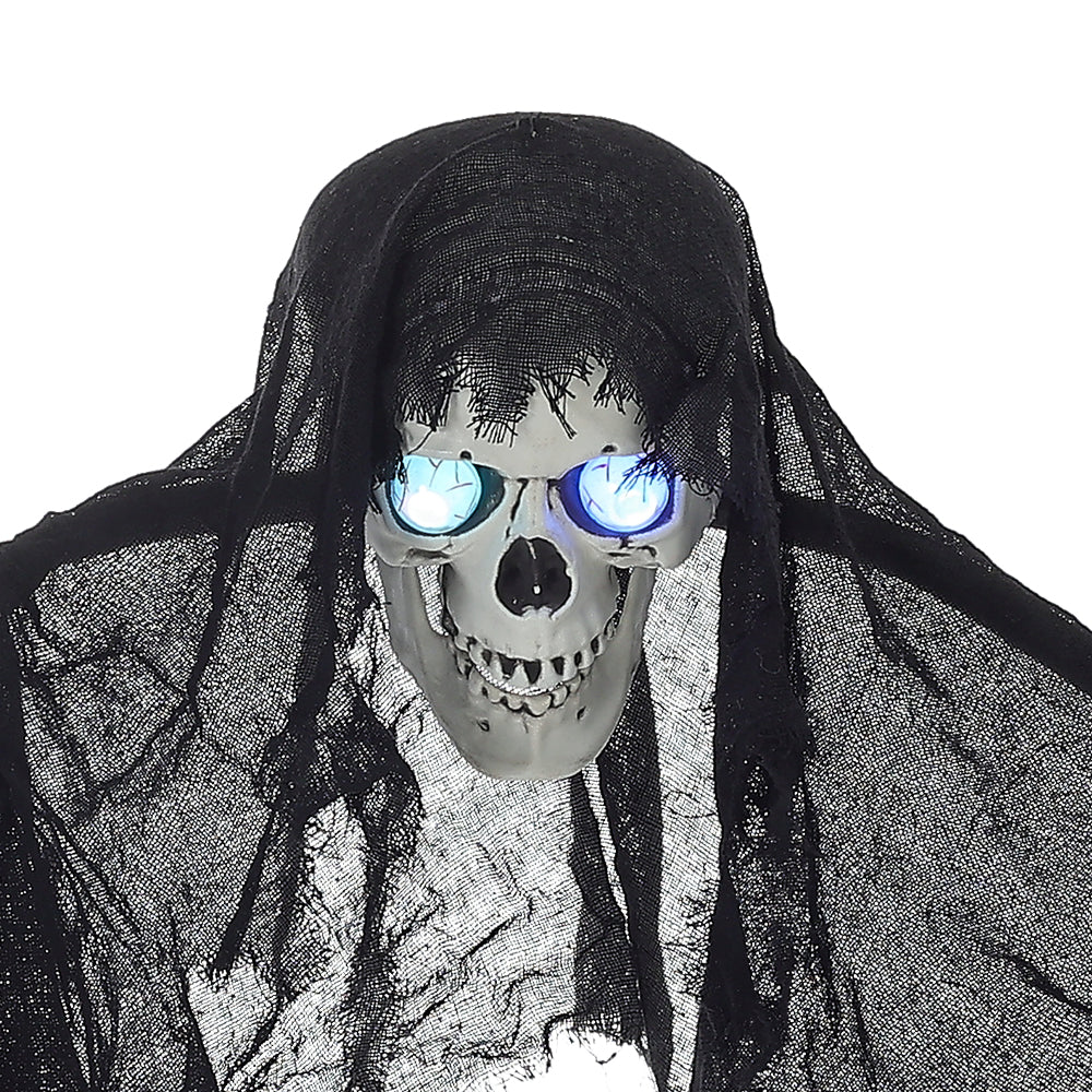 Bring a frightful touch to your Halloween with this Hanging Skull Ghost. Featuring a sinister grinning skull and a ragged black robe that drifts in the breeze, it sets a chilling scene. Flickering LED eyes add an eerie glow, heightening the sense of dread. Hang it from a tree, in the garden, or any visible spot to create an unforgettable haunted display that is sure to startle even the boldest visitors.