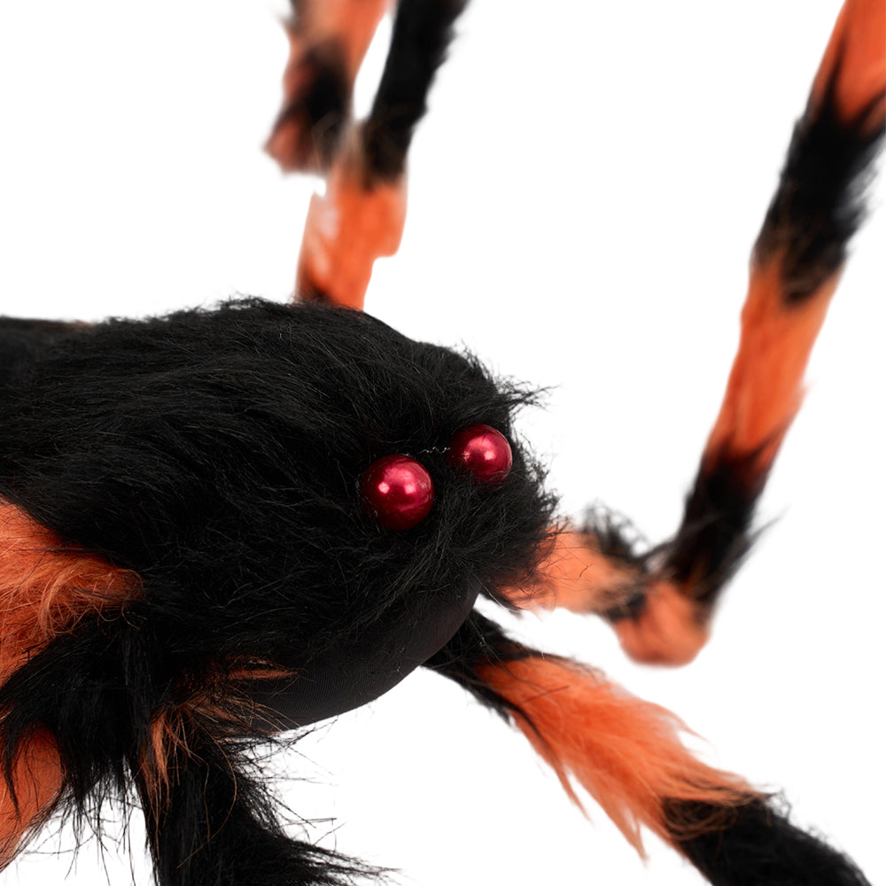 Transform your home into a spooky Halloween scene with this giant spider web and creepy spider. The plush spider features bendable legs and striking red eyes, perfect for lifelike poses. The oversized web can be draped from eaves, balconies, trees, or windows for maximum impact. Made from durable materials, it is suitable for both indoor and outdoor use. Five sturdy ground spikes ensure the web stays secure even in windy conditions.