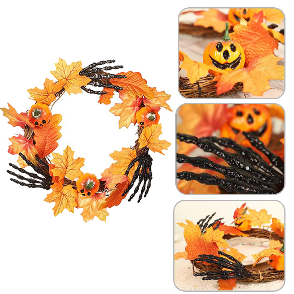 Bring spooky charm to your home with this Halloween wreath featuring maple leaves pumpkins with sinister smiles and eerie hand ornaments springing from a woven branch ring. The design creates a quirky and unsettling atmosphere perfect for the Halloween season. Made of eco friendly plastic materials it is safe durable and long lasting for reuse every year. Its vivid detailing and bold embellishments make it a striking addition to your seasonal decor. Hang it easily on your door or window to welcome guests with festive fright.