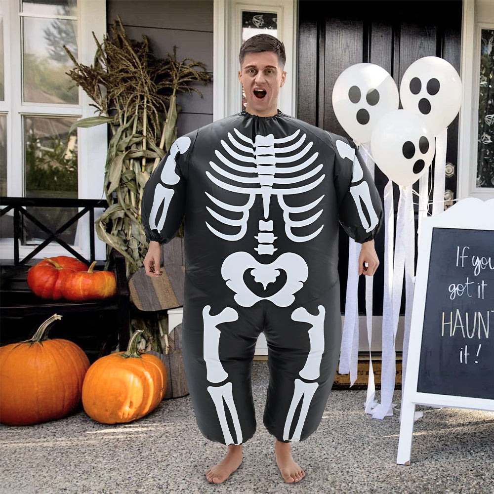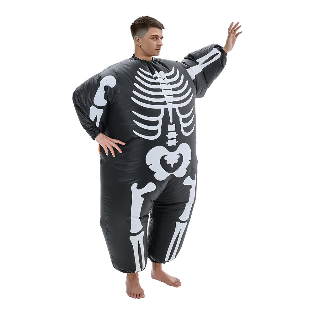 Make a bone chilling entrance this Halloween with this inflatable skeleton costume. Designed with a lifelike skeleton print, it inflates into a bold and intimidating look that instantly grabs attention. The durable polyester fabric ensures comfort and long term use for multiple occasions. A built in fan keeps you cool while you enjoy parties or trick or treating. Easy to wear and deflate, this costume offers a secure fit and convenient storage after the fun.