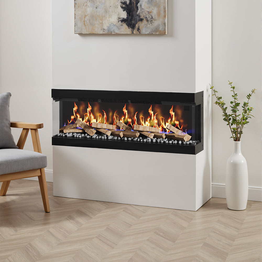 This electric fireplace brings warmth and elegance to your home during colder months. Its three-sided design allows you to enjoy the captivating flame effect from multiple angles, adding a unique decorative feature to your indoor space. With 12 adjustable flame colours and five brightness levels, you can create the perfect ambience, from tranquil soft light to vibrant dynamic effects. The built-in heater allows you to set the temperature between 18°C and 35°C, providing tailored warmth. The ember bed features transparent simulated particles and grey stones that can be arranged to enhance the overall decorative effect, combining practicality with aesthetic appeal.