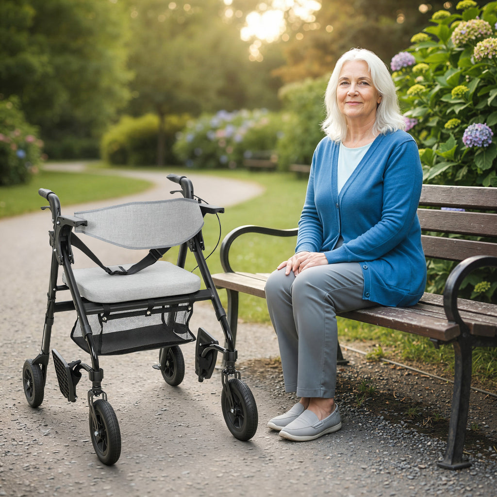 • Wide padded rollator seat with backrest ensures comfort when taking a break
