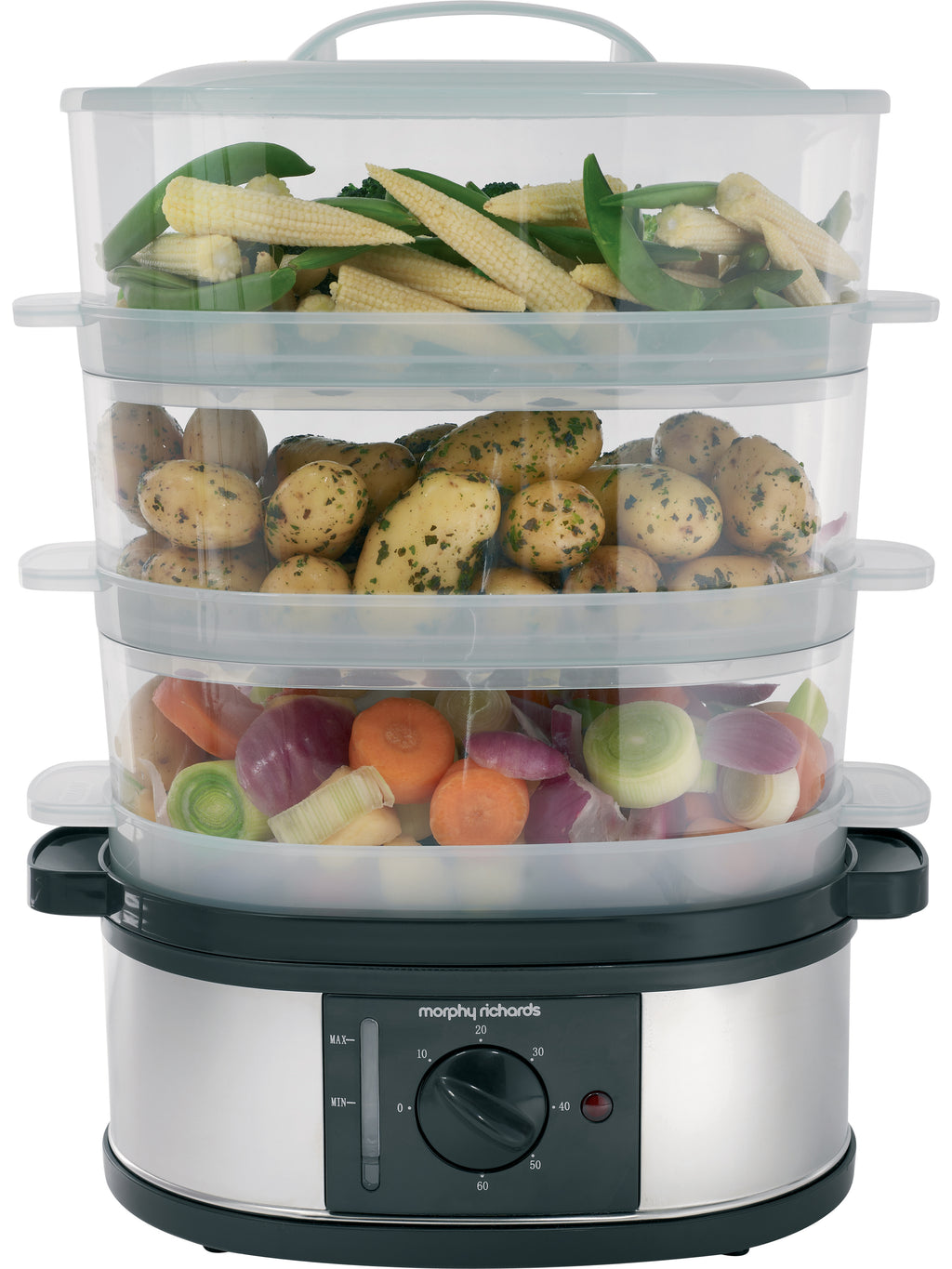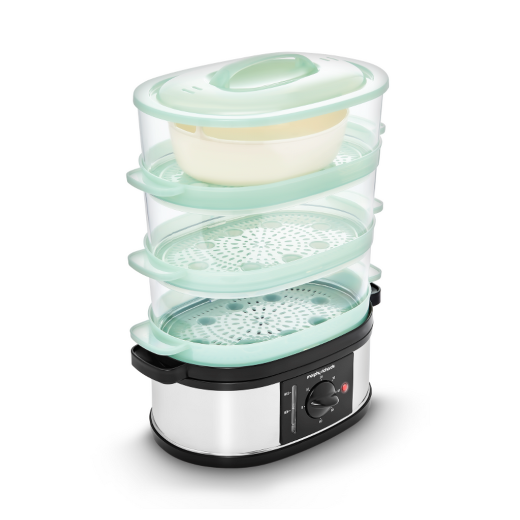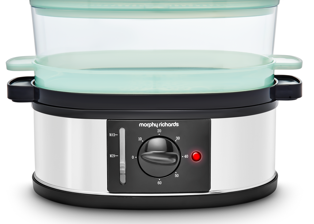 Introducing the 3 Tier Food Steamer, your ideal solution for healthy, tasty meals made quickly and easily. The 9 litre capacity is large enough to cook up a meal for the whole family, and its special features make using it simple and convenient. With an instant steam production, you can start cooking straight away. There's a 60-minute timer along with a bell so you know exactly when your food is done, plus a visible water gauge so you always have an accurate reading of how much liquid is left in the steamer.