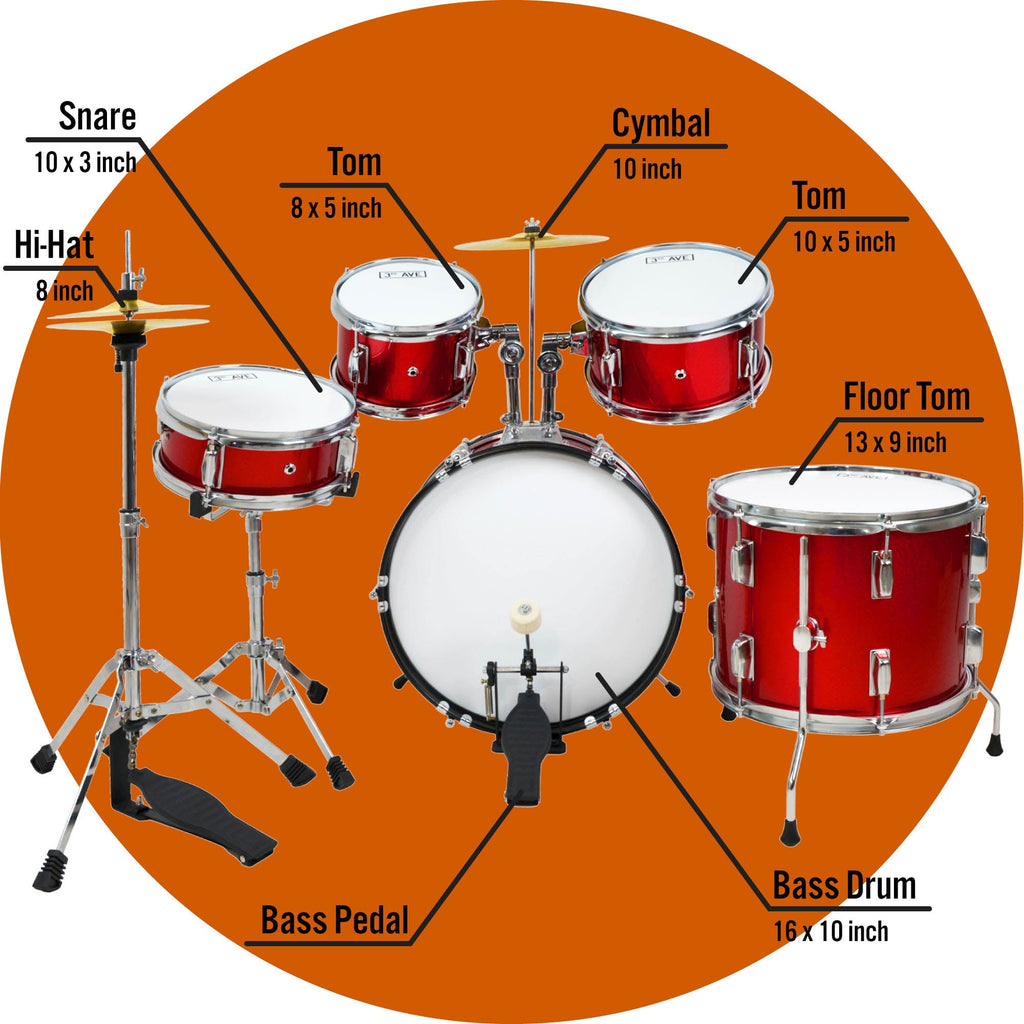 • 16" bass drum with pedal, 13" floor tom, 10" snare, 8" and 10" toms, 8" hi-hat and a 10" cymbal