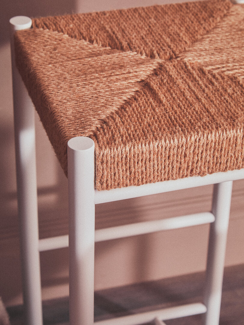The Bandar bar stool features a natural rope seat that brings rustic texture to modern interiors. With its natural rope seat and white beechwood legs, it offers a clean, minimal look. The barstool has a timeless style and includes horizontal bars for stability and a footrest for comfort.