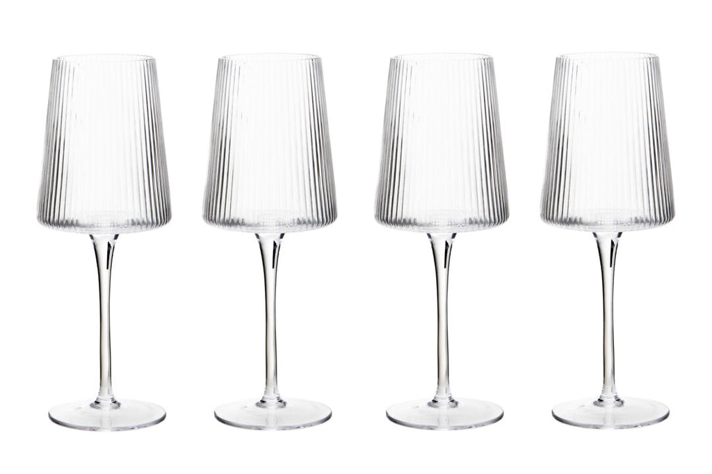This set of four wine glasses has a 430ml capacity, featuring a ribbed-shaped pattern in a symmetrical way to add a luxe accent. Crafted from a clear crystal glass, this wine glass set exhibits a sleek stem supported by a round base. This set comes in a Mail Order Box packaging.