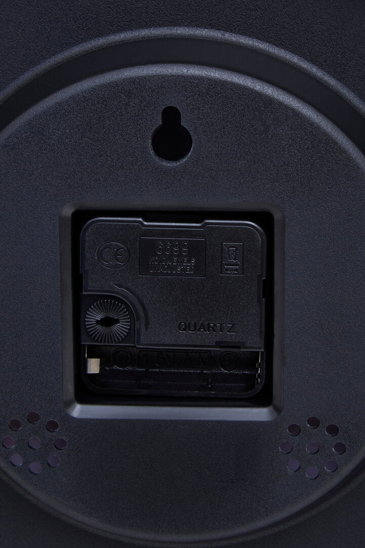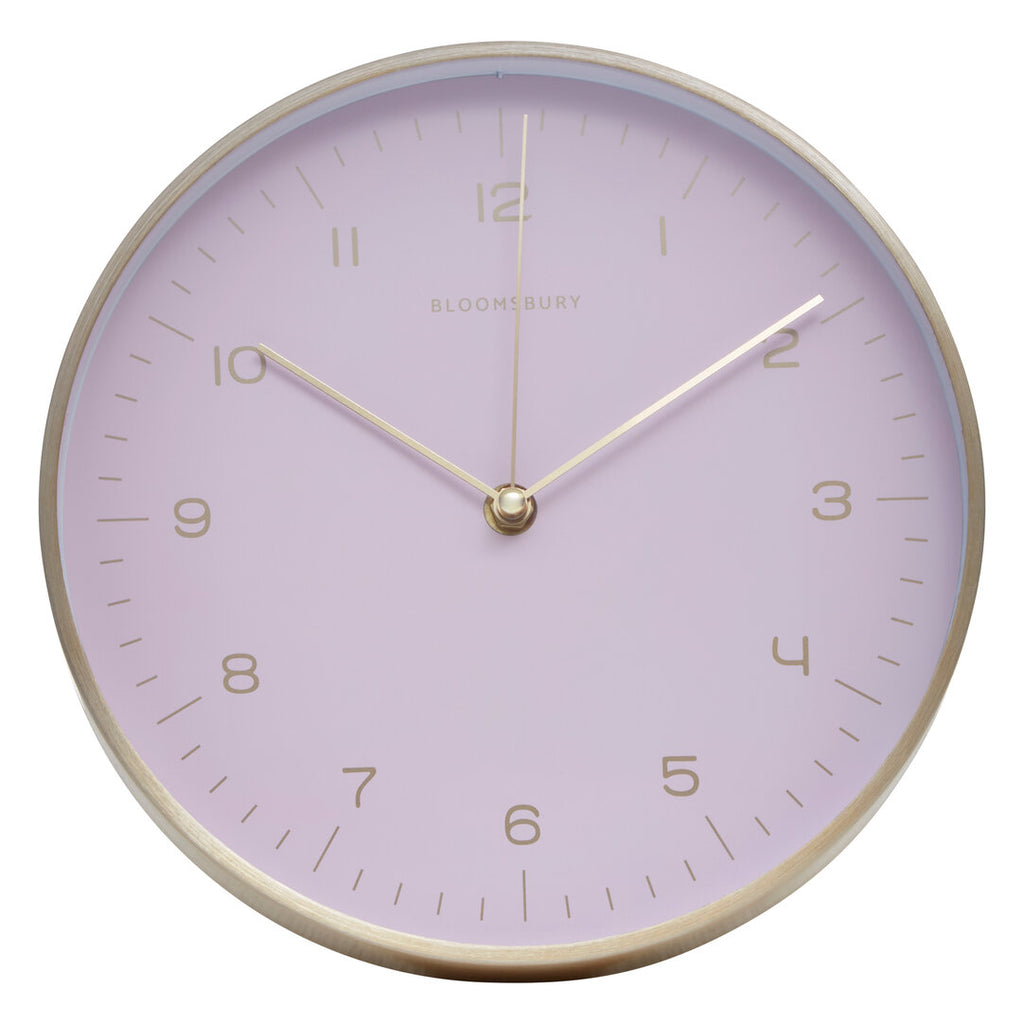 This round wall clock has a gold finish metal case that features a striking contrast with its pastel pink face. The gold hued numbers, batons and needles are accentuated on the pink dial which enhance its readability and visual appeal.
