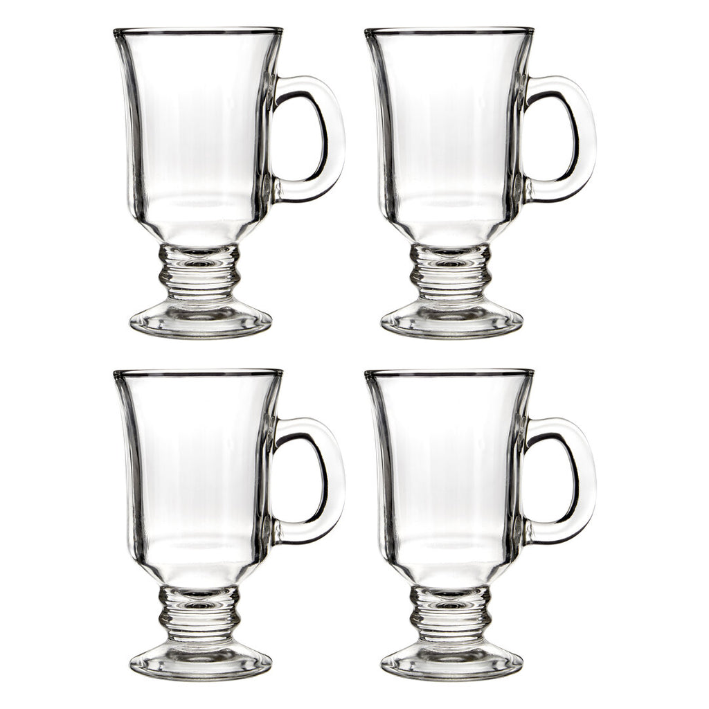 This classic set of four Irish coffee glasses is crafted from glass, perfect for showcasing layered hot beverages. Each glass features a traditional design with a sturdy footed base, a gently tapered body, and a comfortable handle for easy gripping. Ideal for serving Irish coffee, mulled wine, or hot chocolate, these glasses combine timeless style with practical functionality.