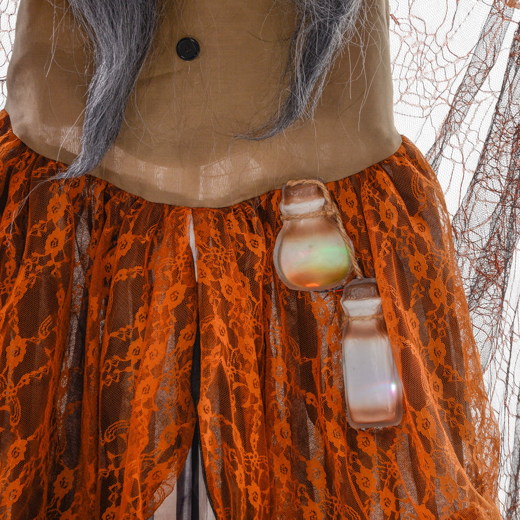 Unleash spine-chilling thrills with the HOMCOM animated Halloween prop, featuring a fat-faced witch with a glowing potion bottle on her waist, her arms are bendable. Triggered by touch or piercing screams, this fiendish figure turns its head, waves its hands, boasts eerie red glowing eyes, a colourful glowing potion bottle and creepy witch sound effects, making it a standout Halloween outdoor decoration for any haunted house or outdoor Halloween decor.