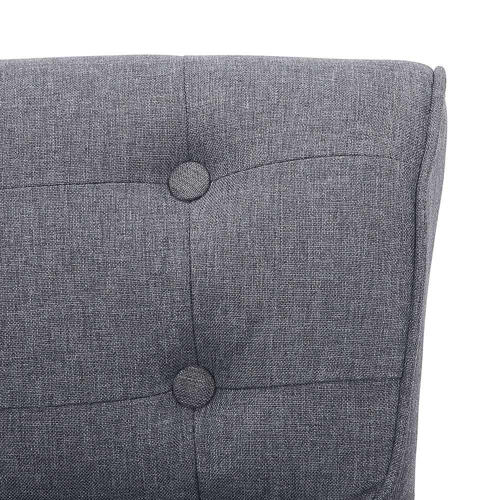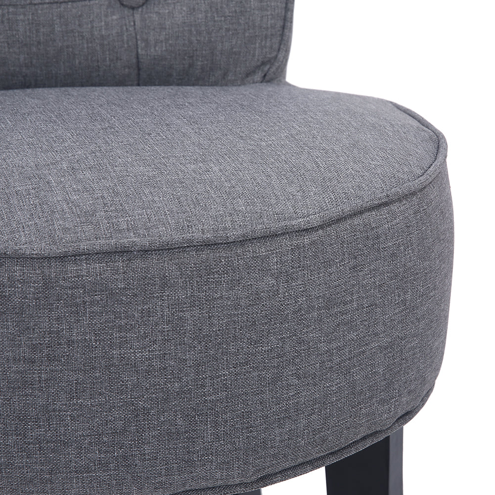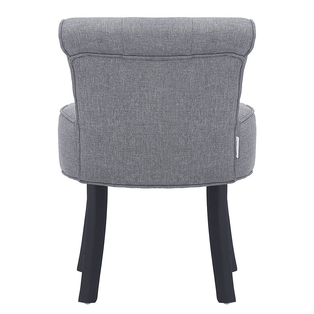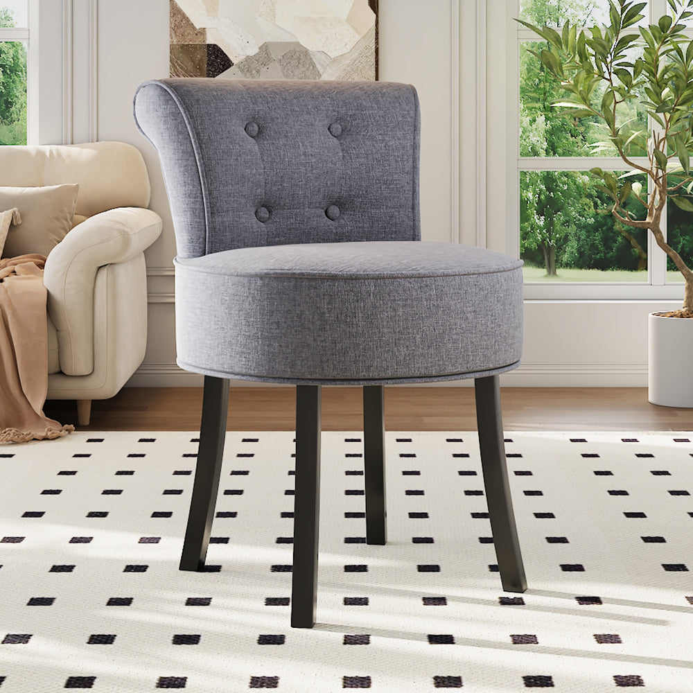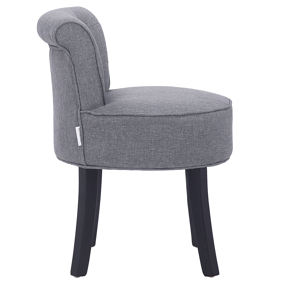 Bring refined charm to your home with this elegant vanity stool. Upholstered in timeless grey linen and supported by sleek black rubberwood legs, it offers a subtle sophistication that blends effortlessly with any décor. Button tufting on the back adds both style and comfort, while the high density sponge padding provides lasting softness and support to ease fatigue during long use. Designed with ergonomic lumbar and back support, it encourages a comfortable sitting posture. Versatile in function, it serves perfectly at a dressing table or as additional seating in the bedroom, living room, or study.