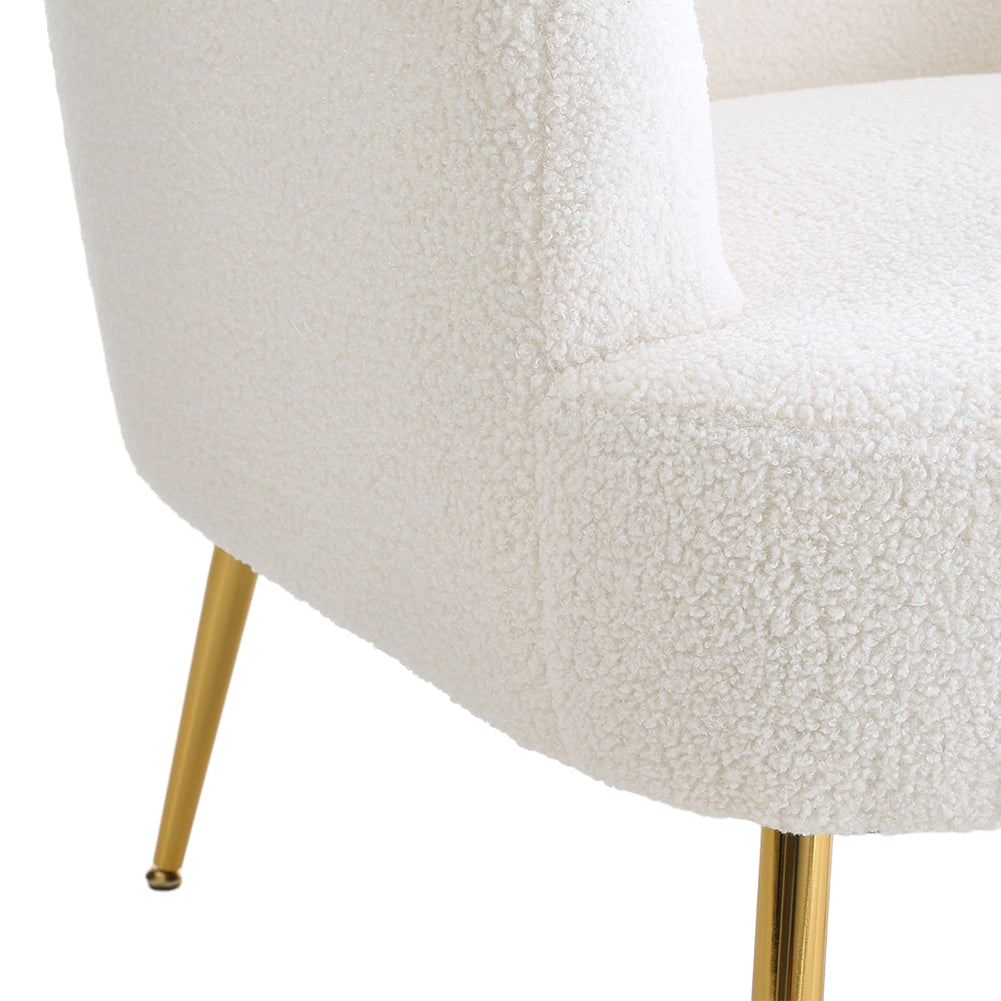 Sink into the cloud-like comfort of the Livingandhome White Teddy Fabric Armchair. Built on a solid wood frame, it features a soft, rounded silhouette with gently curved arms and a dense foam-filled back for a plush, inviting feelâ??perfect for lounging or reading. Supported by four slim, tapered, angled legs, its contemporary design makes it a stylish and cosy addition to any living room.