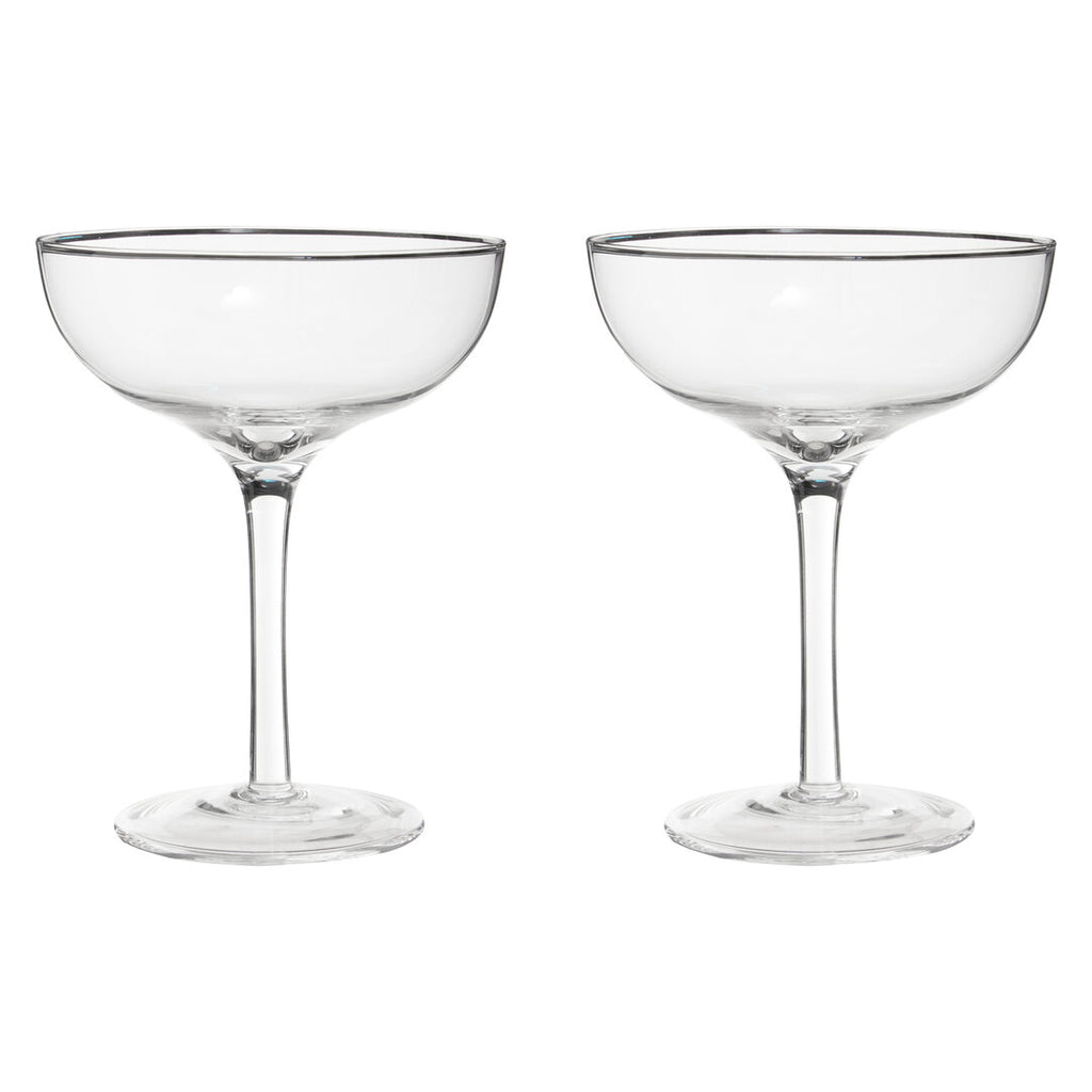 Pair of cocktail glasses with a rounded bowl and sleek stem. A contemporary take on a coupe glass with its wide bowl that suits sweeter cocktails and champagnes.