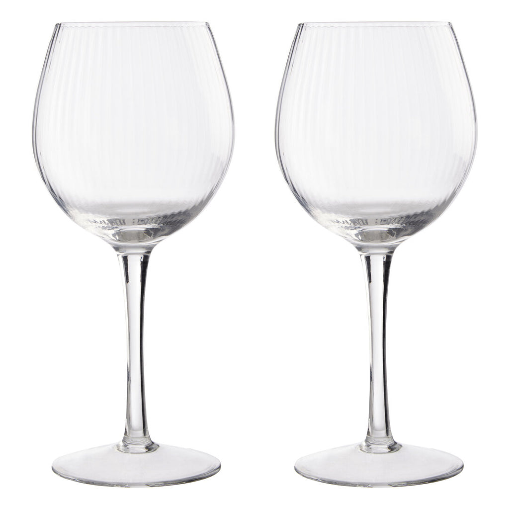 This set of two clear gin glasses boast sophistication with their rounded bottom and fluted texture. The generous bowl allows gin botanicals, citrus garnish or mixers to blend together.