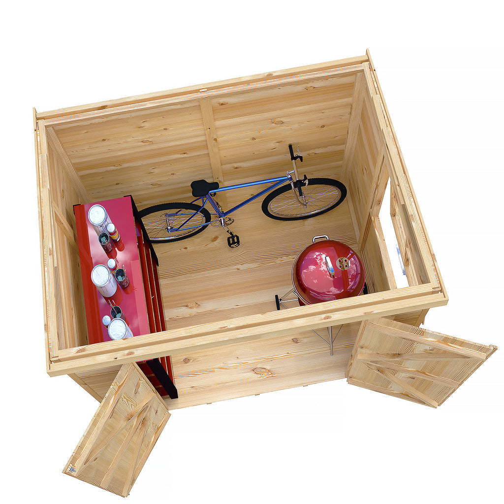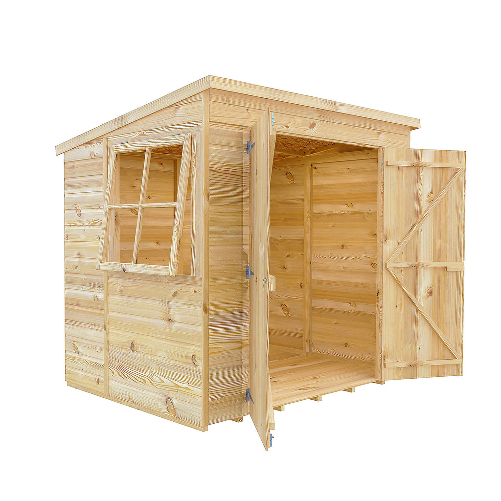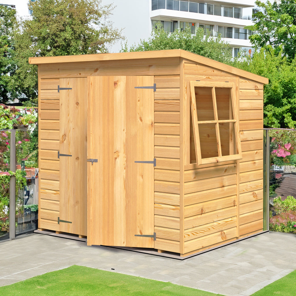 Compact garden shed ideal for all your storage needs. Manufactured from high grade, FSC approved timber with 12mm shiplap tongue and groove cladding over sturdy 34mm square framing with OSB roof and T&G floor. One opening glass window and double doors with padbolt supplied ready for your own padlock. Dipped base coat preservative ready for you to top coat.