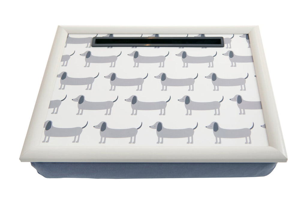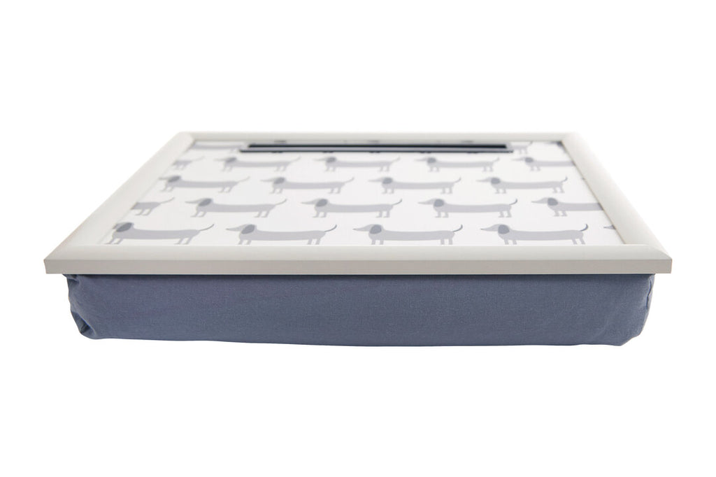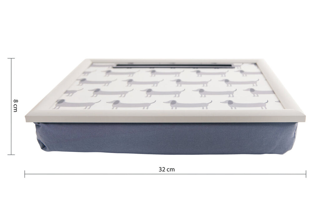This lap tray has bolster filled with breathable foam microbeads, keeping it comfortable and lightweight. It also features a deep tray with a rim to keep ipads and other devices from slipping off during transport.